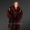 - A beautiful wine color coat artfully dyed from natural pelts of arctic fox fur.