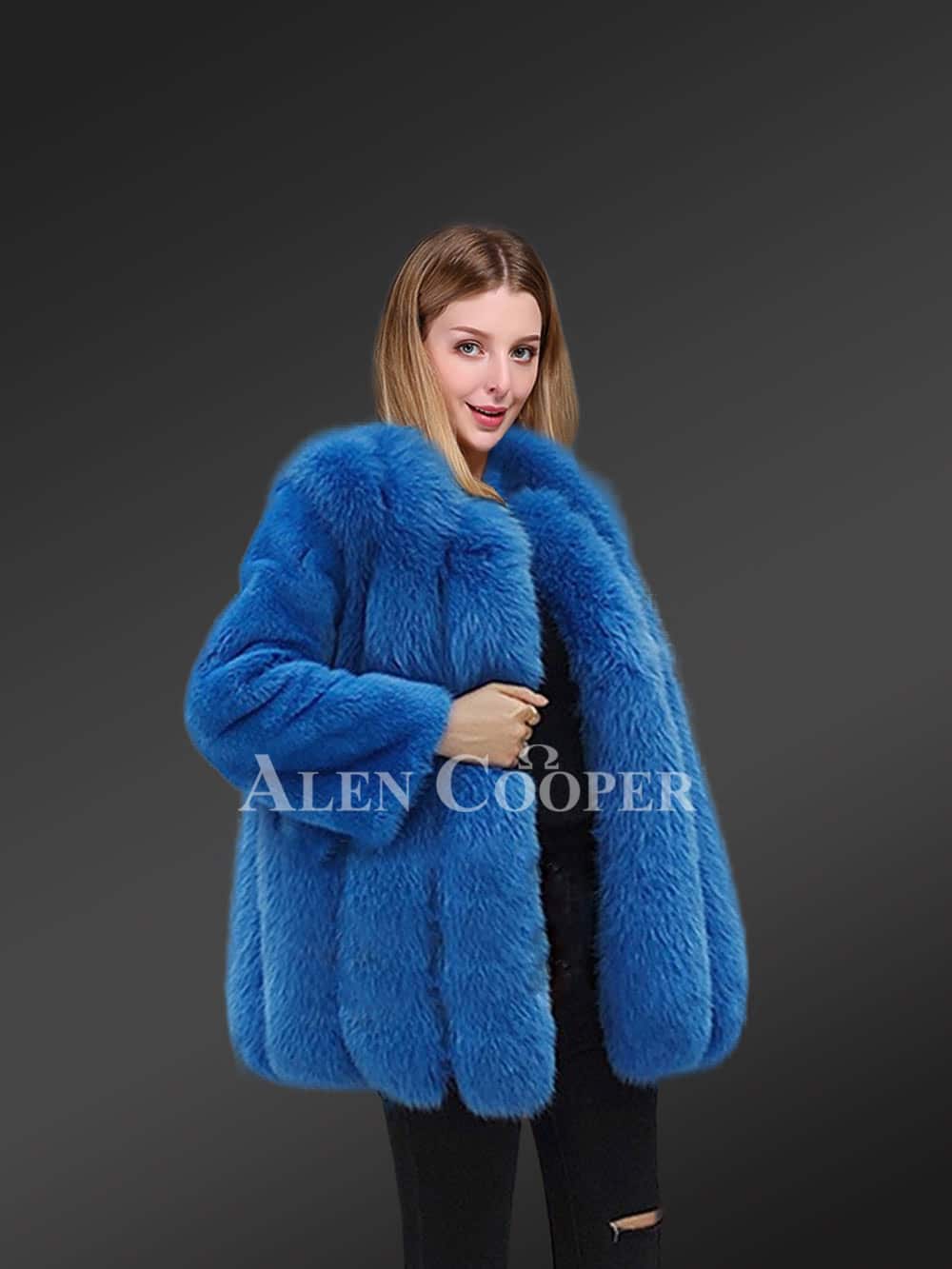 This luscious coat is made from superior Arctic fox fur and features a dense finish with front open clip lock hooks. It has vertical stitch detailing throughout the whole body for a voluminous look. The premium quality arctic fox outerwear is a classy yet trending piece in the fashion industry. The eye-catching paragraph-style long coat uplifts the coat to high fashion. The full-length baggy sleeves are made from full-skin mink fur also dyed blue. The mixed fur winter coat is a perfect fit for a timeless look.