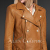 The angled front pocket trait contributes to a modern trend. It is secured with zipper closing. Collar-down is descended by notch lapels, which further shape the exquisite double breast accent. Dual column snap button captivates the glamorous silhouette. The golden tone buttons is a compliment to the solo tan shade.