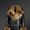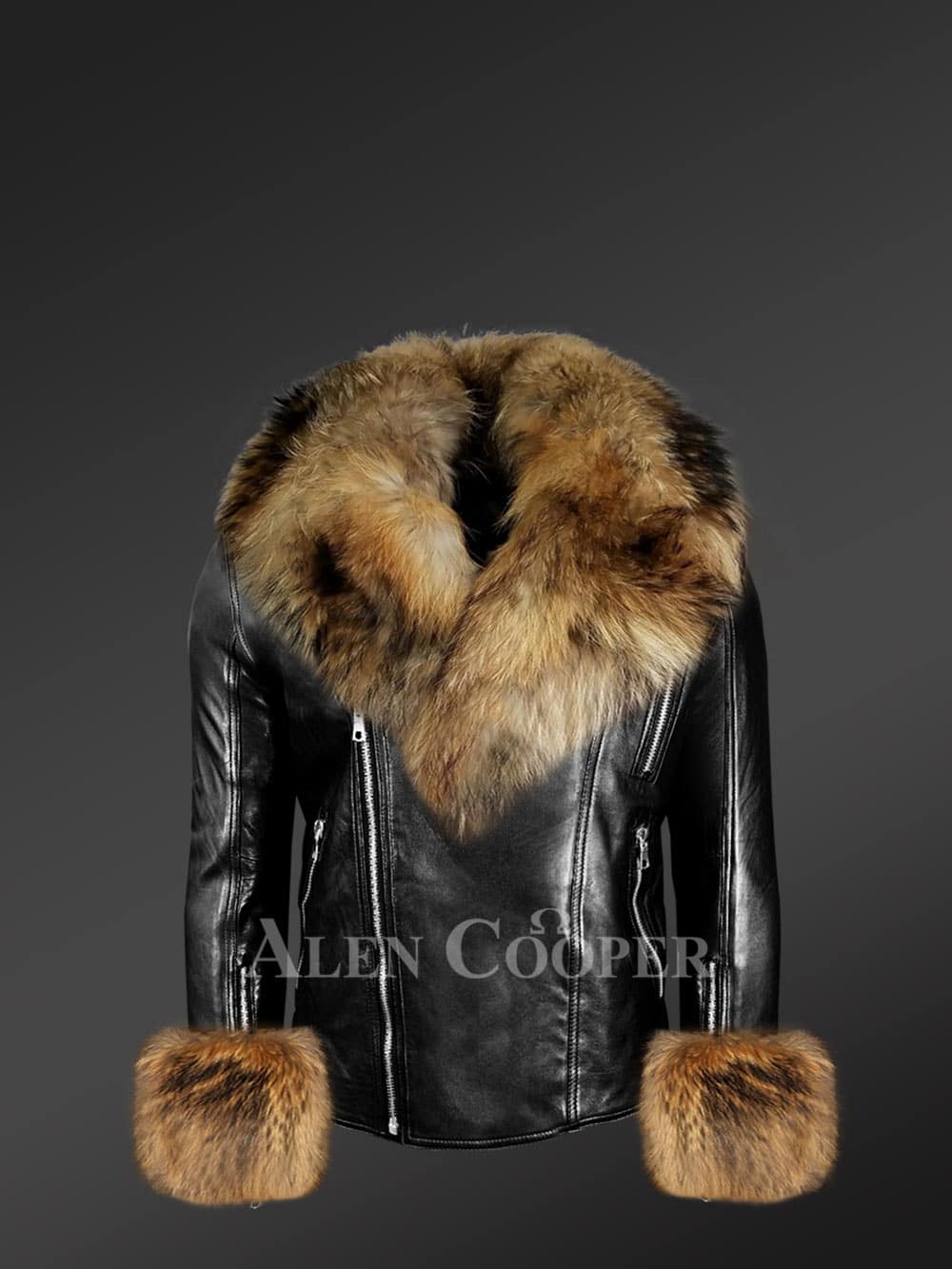 • The leather jacket has a striking collar and handcuffs both made of genuine Finn raccoon fur pelts