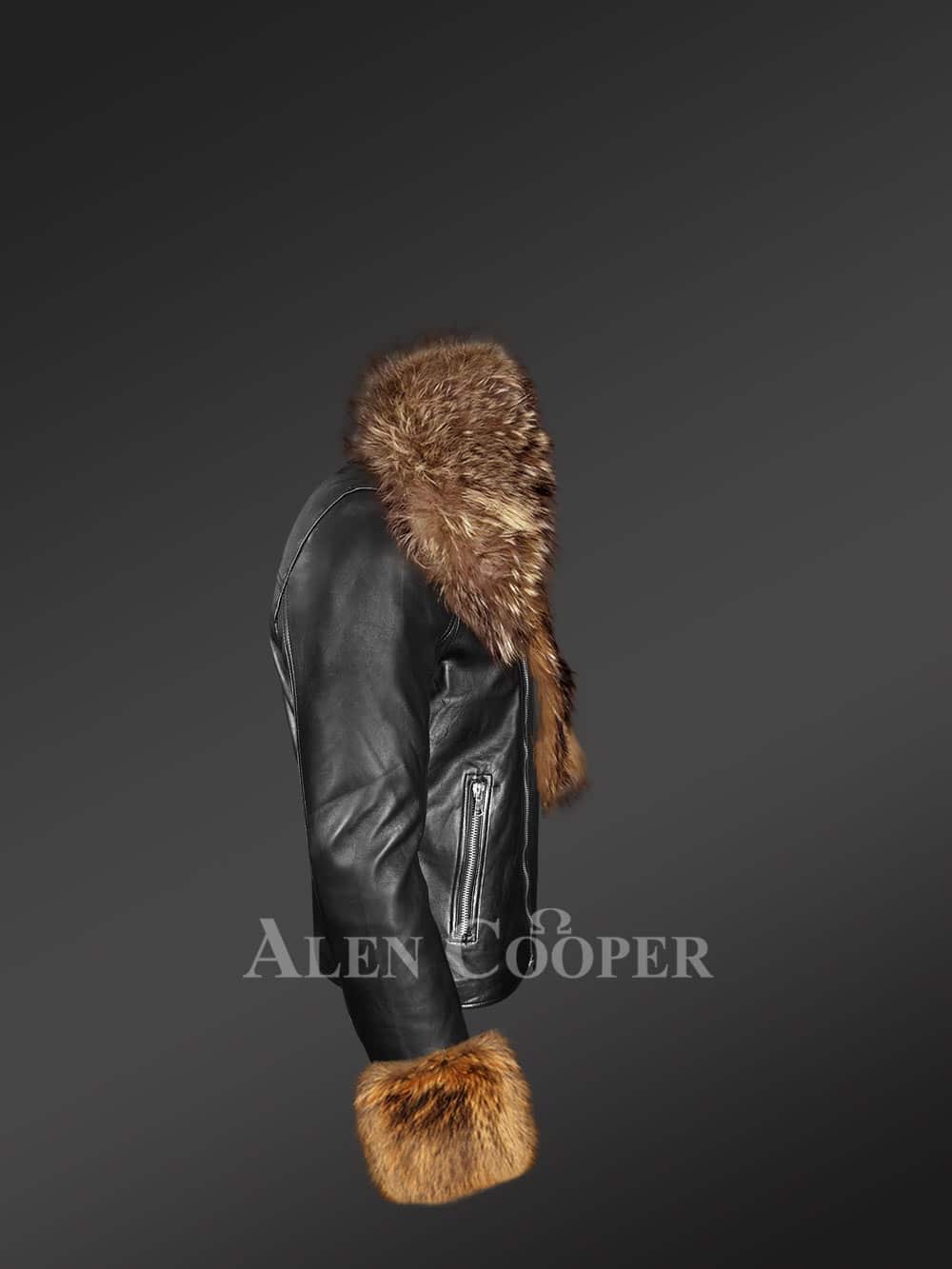 This deluxe jacket also has a notched lapel of lambskin leather. Therefore, one has the option of wearing it with or without the additional warmth and charm of raccoon fur. It certainly gives one more styling options. The asymmetrically set metal zipper and zippered pockets are some of the key features of this jacket.