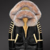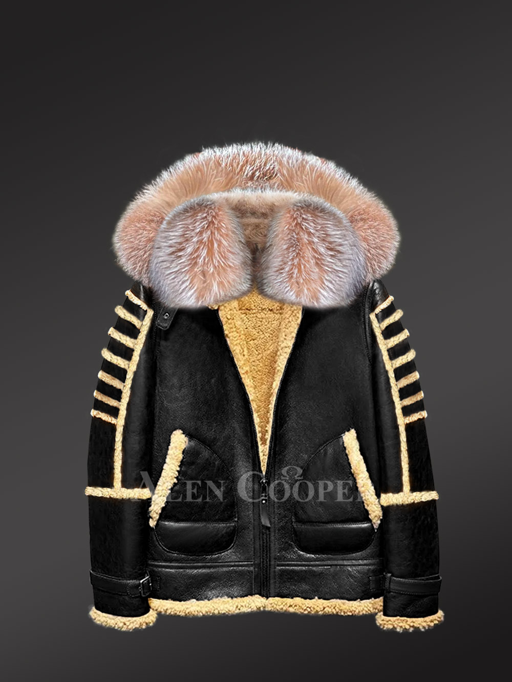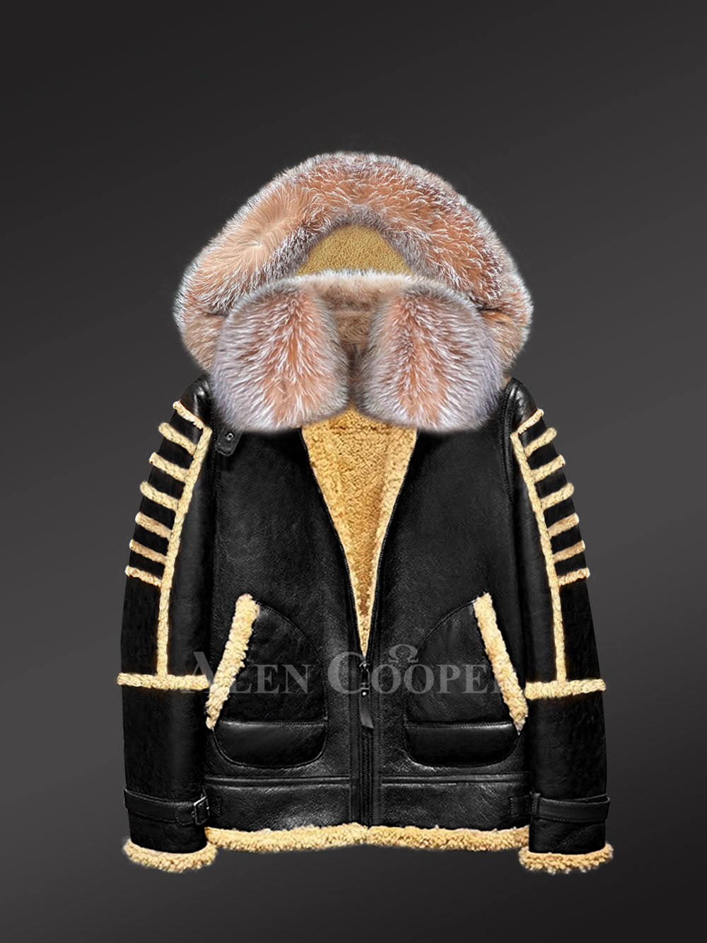 Black Shearling Jacket with Premium Crystal Fox Fur and Hood