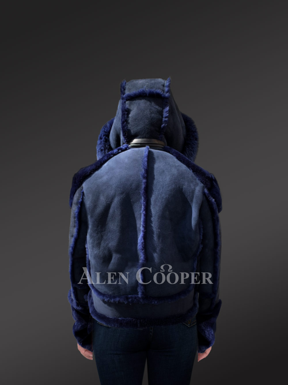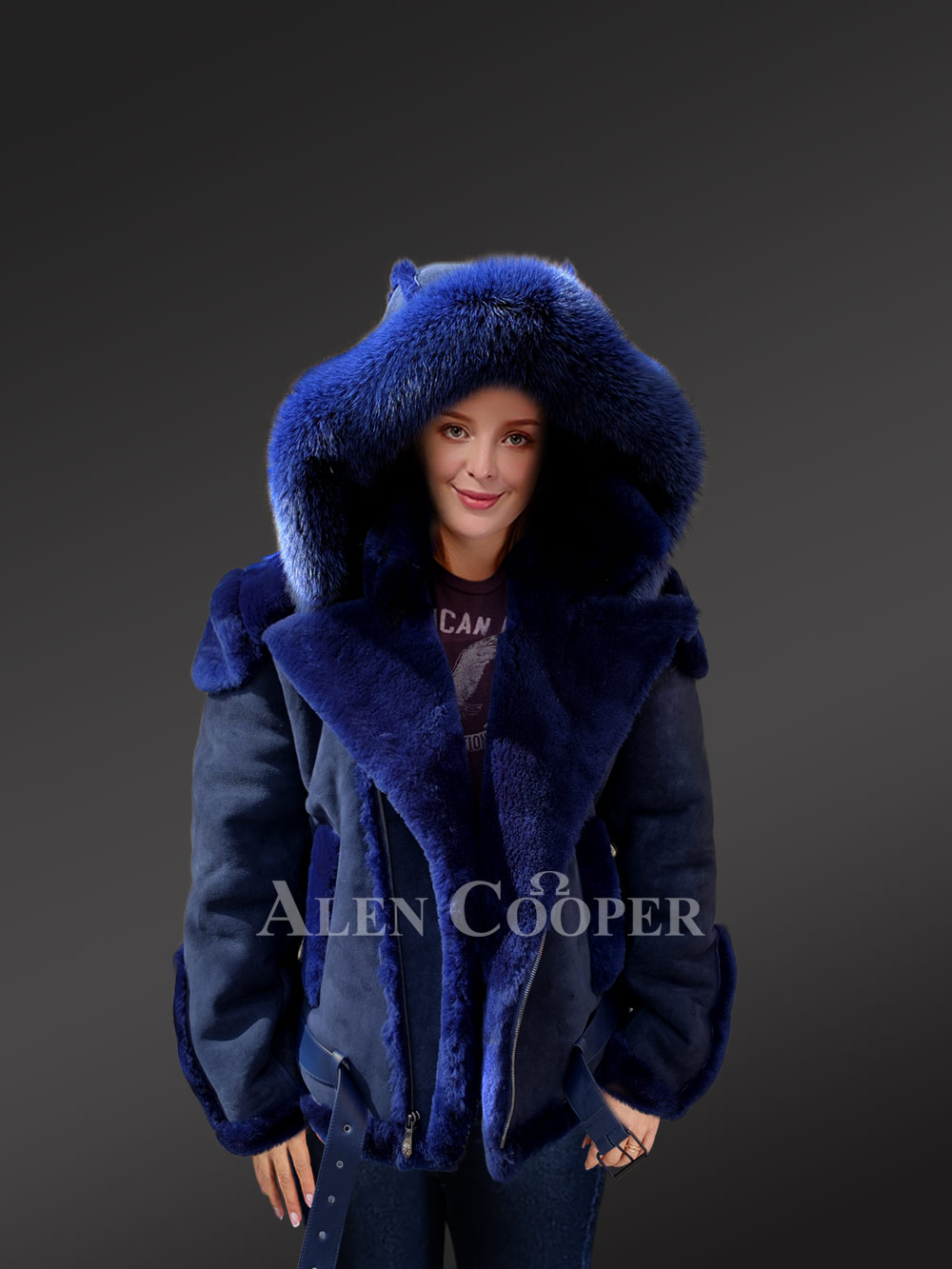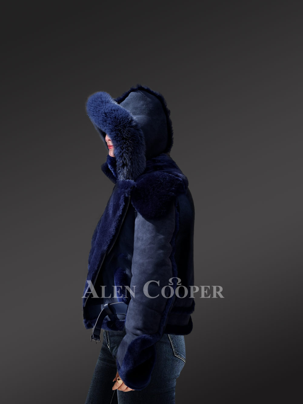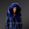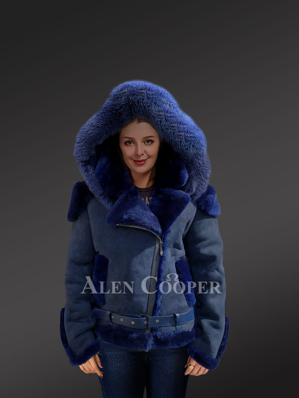 The Biker Style Shearling Jacket is designed with unparalleled style and sophistication. The suede finish jacket has the most striking feature and that is the elegant fur hood. The zip-out hood is plated with fox fur trims. Designed with creativity and innovation, the blue suede jacket is crafted by hands.
