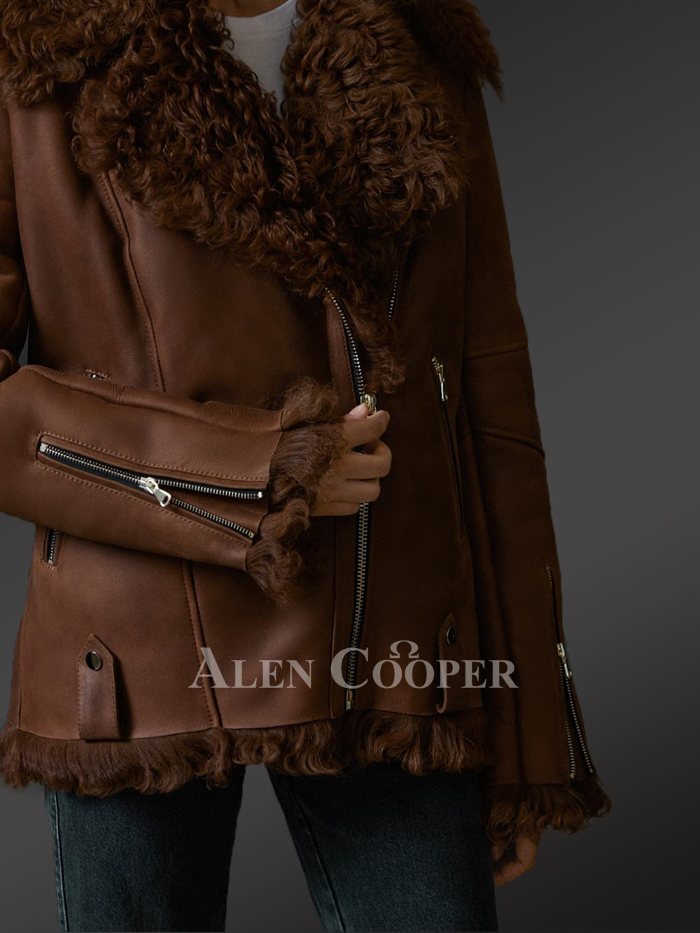 Made from authentic pelts of shearling or lambskin, the Nappa finish dark brown jacket will be a great addition to your fashion wardrobe. Made from one of the finest varieties of shearling, the sheepskin shearling jacket for women is well detailed with merino brown fur detailing. You can easily recognize the highlights with curly hair. The texture of the outerwear is soft and supple. The sheepskin shearling jacket for women is completely designed by hand.