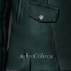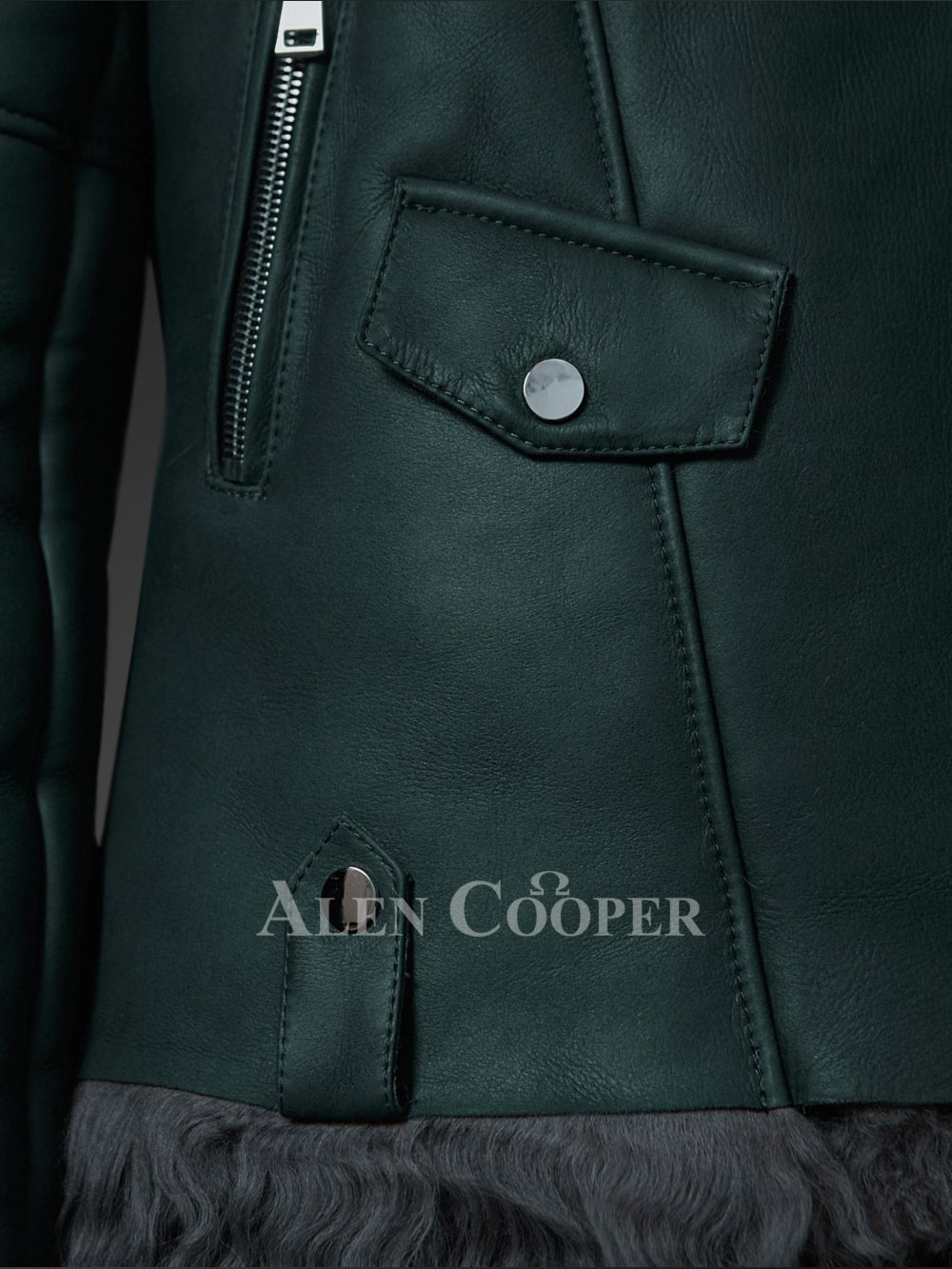 • The emerald color Toscana lambskin jacket has a spacious pocket with a distinct button at lower bottom on the right, whereas on the left, the pocket has zippers