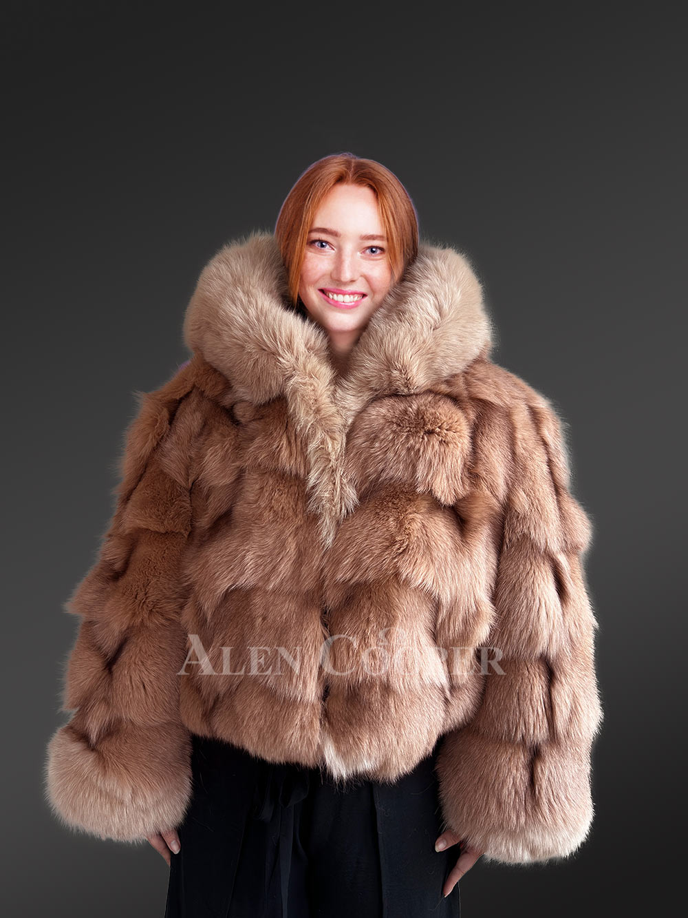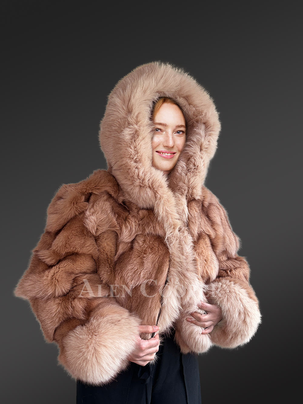 This luxurious womens fox fur crop jacket is designed using sections of fur from Blue Fox. Its wavy texture results from the artistic assembly of sectioned pelts dyed in a soft shade of beige. Alongside making a woman look like a diva, this jacket can keep one warm and comfortable throughout the winter with long baggy sleeves, broad collar, modish front-line and hood.