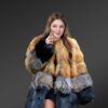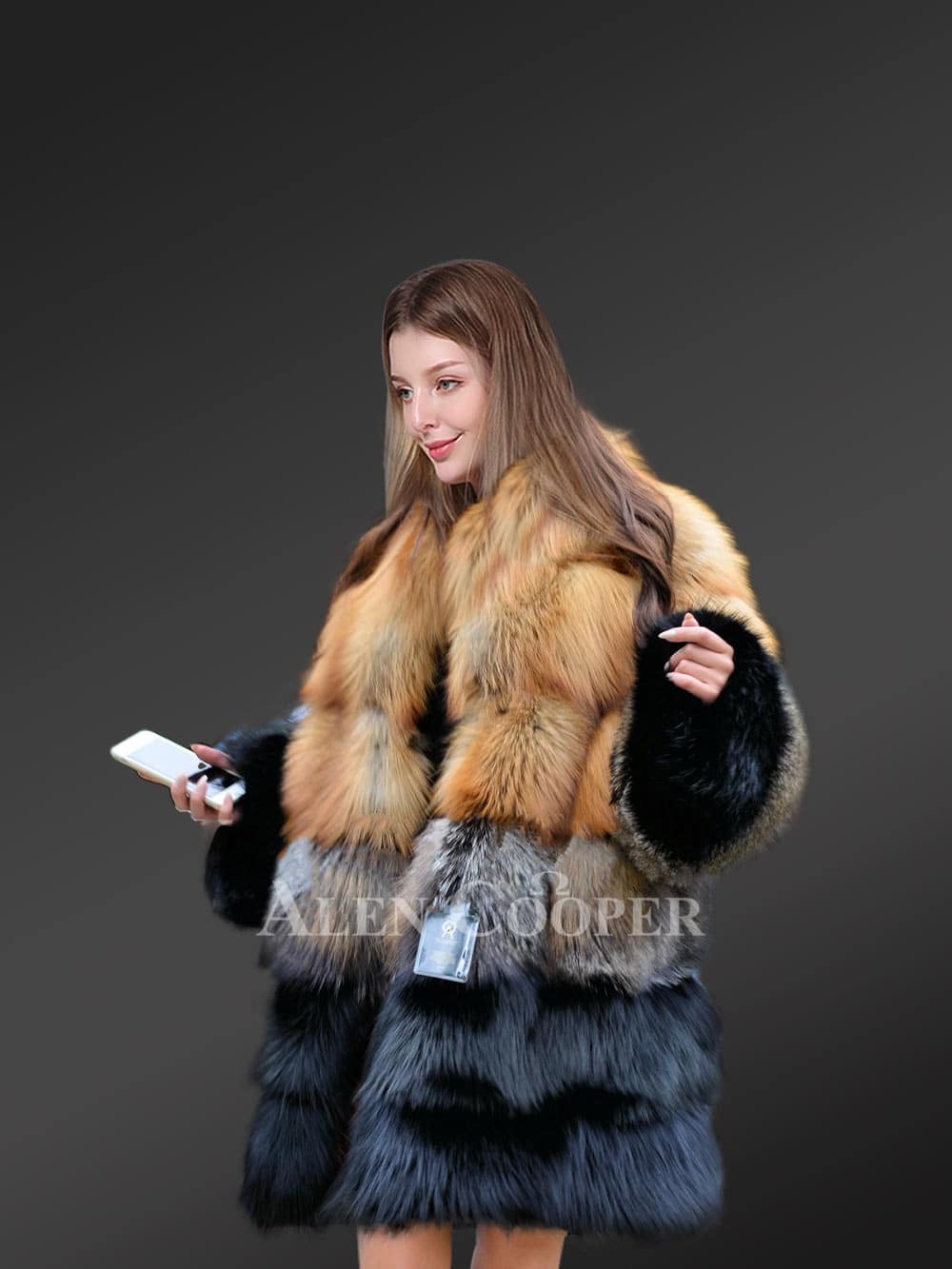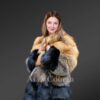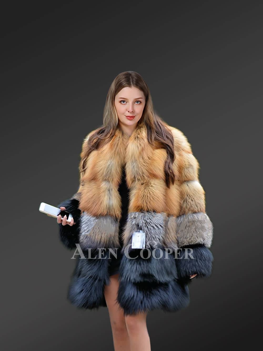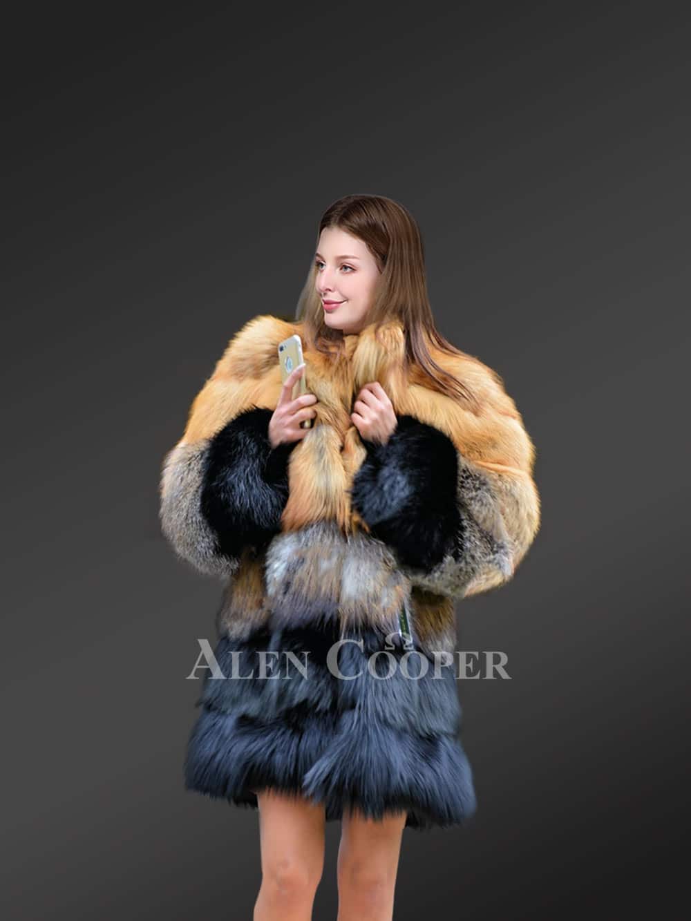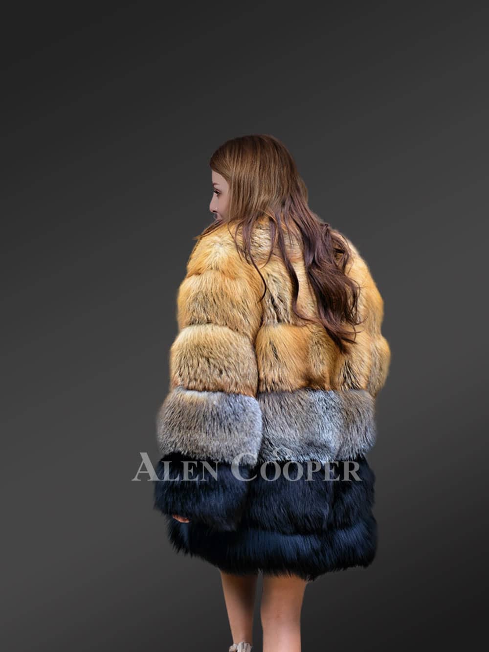 This exquisite fox fur multicolored coat can be the ultimate outfit for parties or fests in winter because of its gorgeous looks. The upper tiers are designed using the pelts from Red fox while the fur from Silver fox forms the lower tiers. Without a doubt, this outfit looks magnificent in reddish yellow and bluish grey shades. Furthermore, the paragraph pattern arrangement of the fur magnifies its elegance.