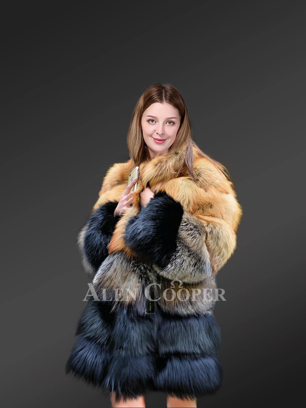 - Luxurious coat of original fox fur looks marvelous in natural shades of fur from Silver fox and Red fox