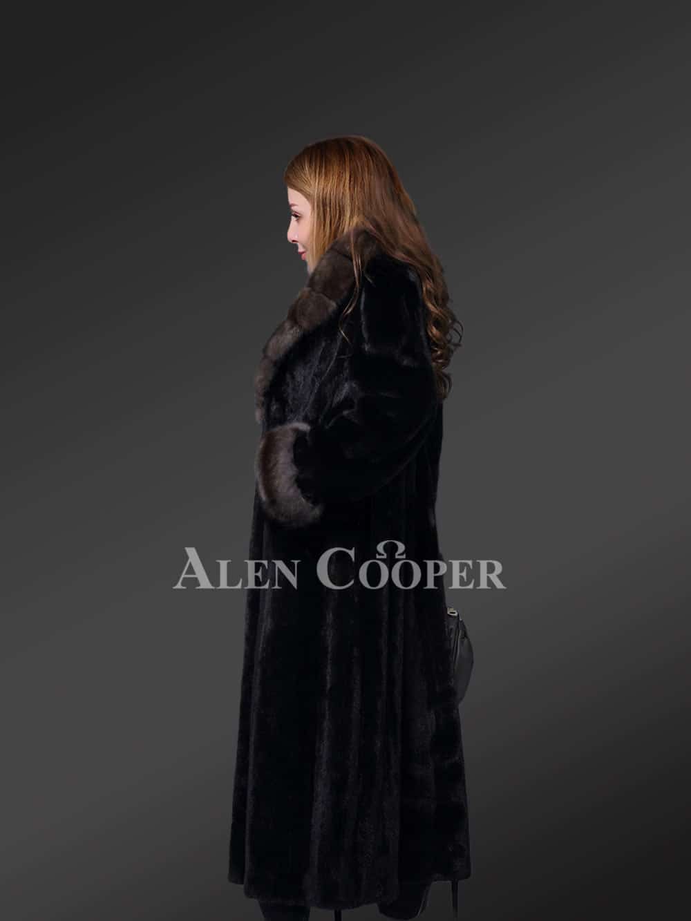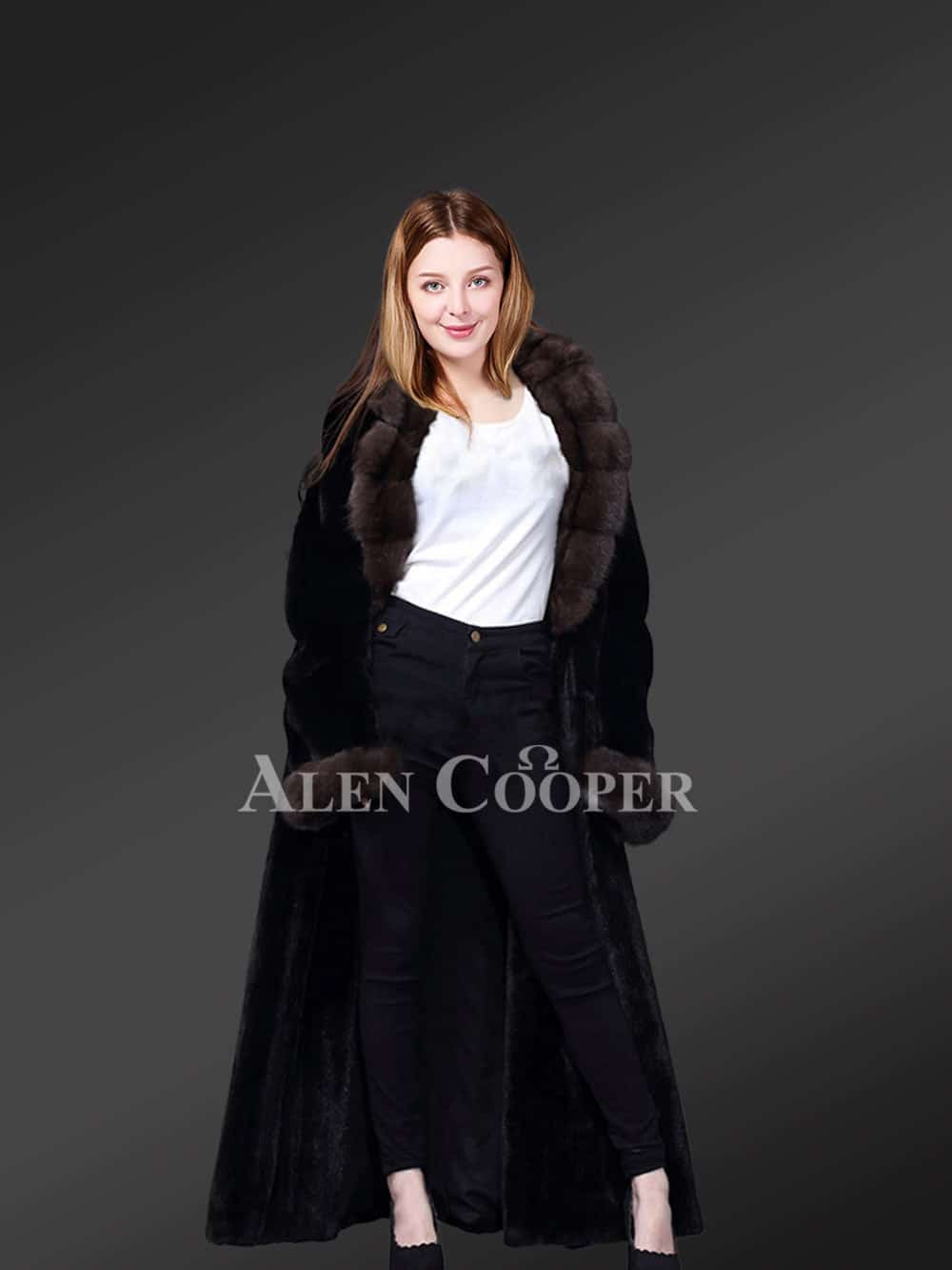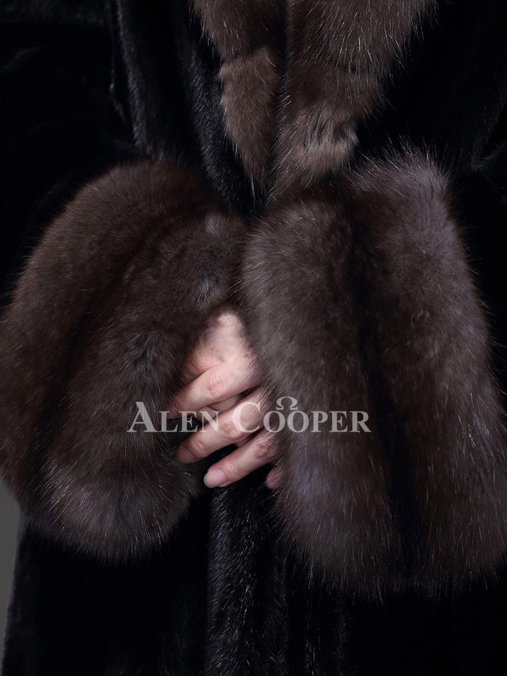Made of Premium Quality Mink Fur, this authentic Black Coat is soft and silky in texture and is highly lustrous. This Full Length attire will provide you the warmth needed in severe winter climate, with an extra glamour.With Full Length Sleeves, the Cuffs and the Lapel is Trimmed with a shade of Brown Sable Fur which makes the Coat more gorgeous. Like Mink, Sable fur has been a highly valued item in the fur industry and is generally considered to have the most beautiful and richly tinted pelt. Sable fur is unique because it retains its smoothness in every direction it is stroked. The Coat has High-End Classical style with Waist Level Spacious Side Pockets to give you a cozy feel in cold days. This Lengthy Coat is Fully lined with a Satin Finish Lining and has a Hidden Hook and Loop Fasteners as a Closure to give a perfect fit look to the stylish women.