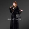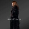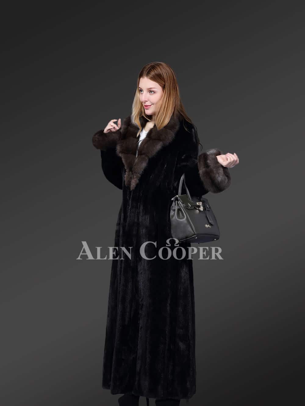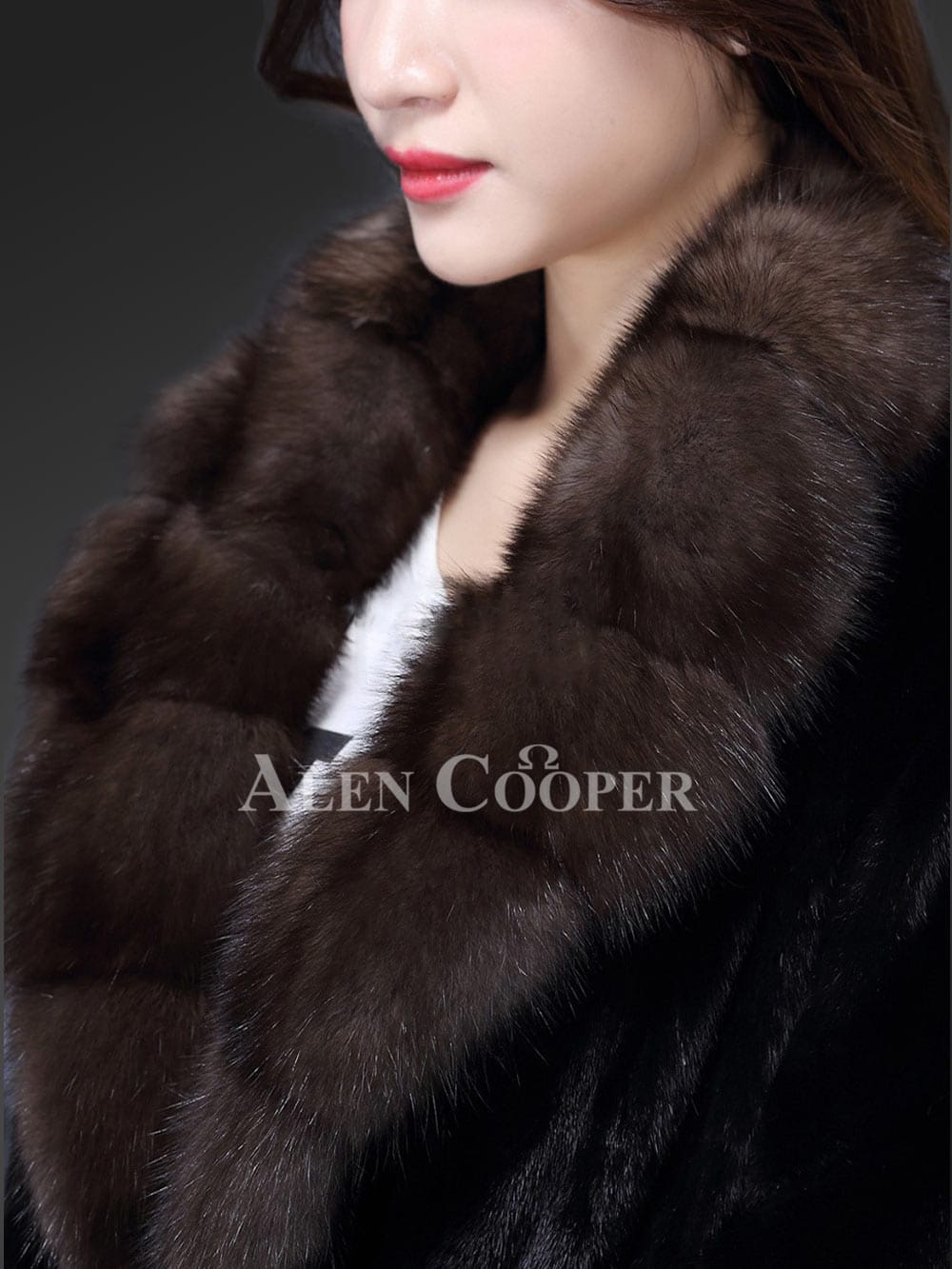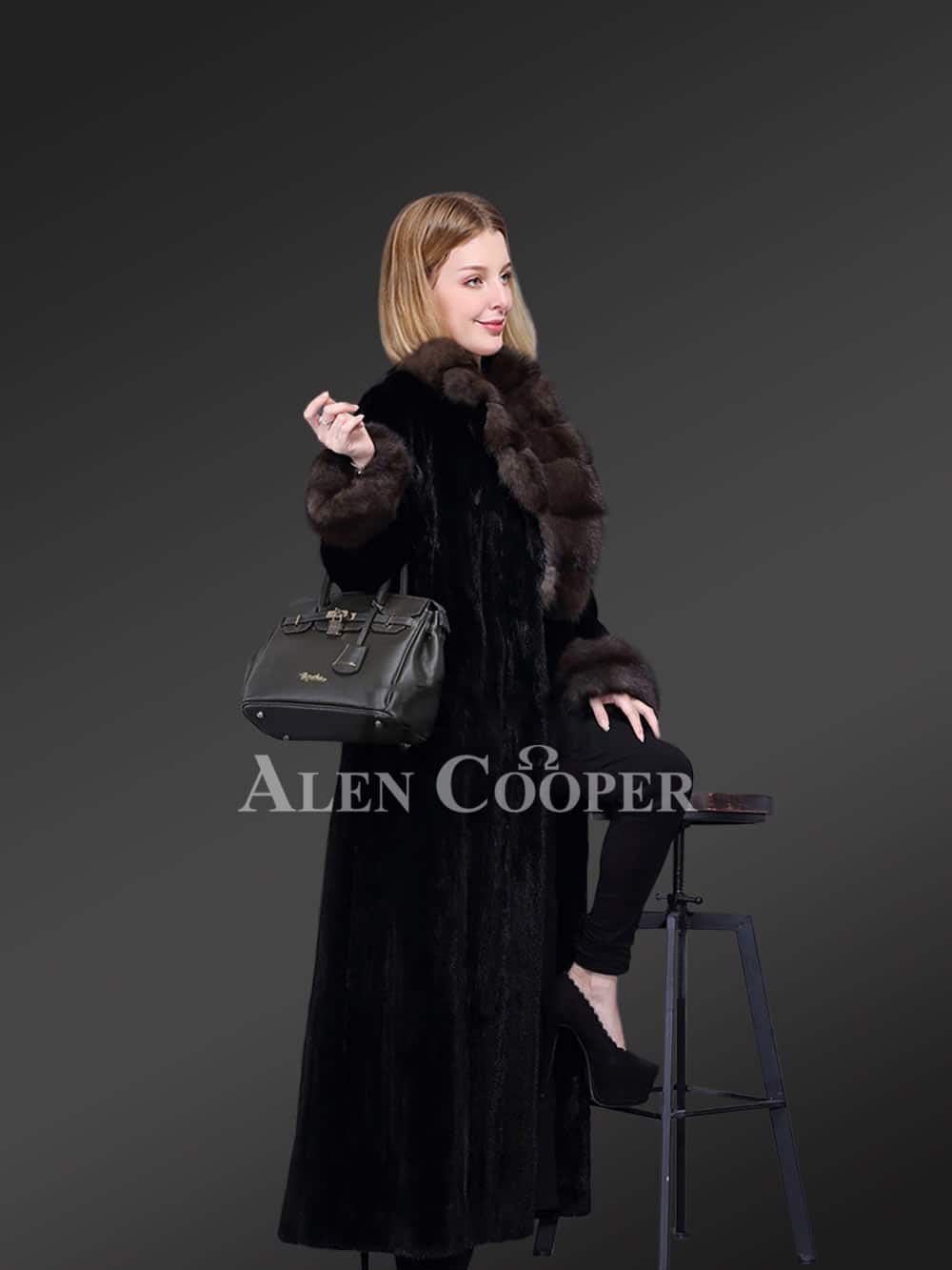 Made of Premium Quality Mink Fur, this authentic Black Coat is soft and silky in texture and is highly lustrous. This Full Length attire will provide you the warmth needed in severe winter climate, with an extra glamour.With Full Length Sleeves, the Cuffs and the Lapel is Trimmed with a shade of Brown Sable Fur which makes the Coat more gorgeous. Like Mink, Sable fur has been a highly valued item in the fur industry and is generally considered to have the most beautiful and richly tinted pelt. Sable fur is unique because it retains its smoothness in every direction it is stroked. The Coat has High-End Classical style with Waist Level Spacious Side Pockets to give you a cozy feel in cold days. This Lengthy Coat is Fully lined with a Satin Finish Lining and has a Hidden Hook and Loop Fasteners as a Closure to give a perfect fit look to the stylish women.