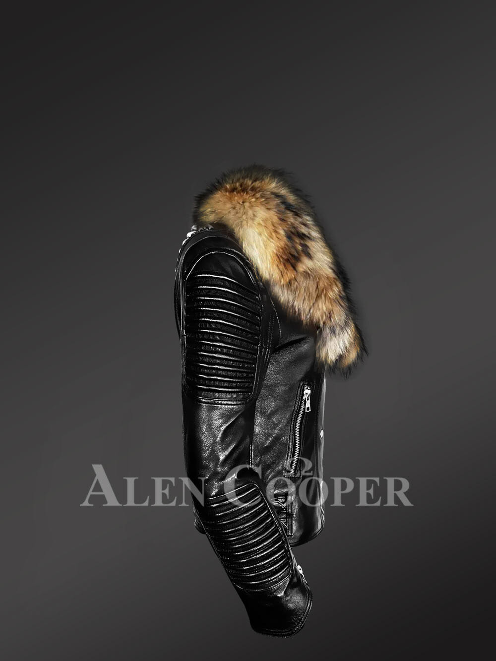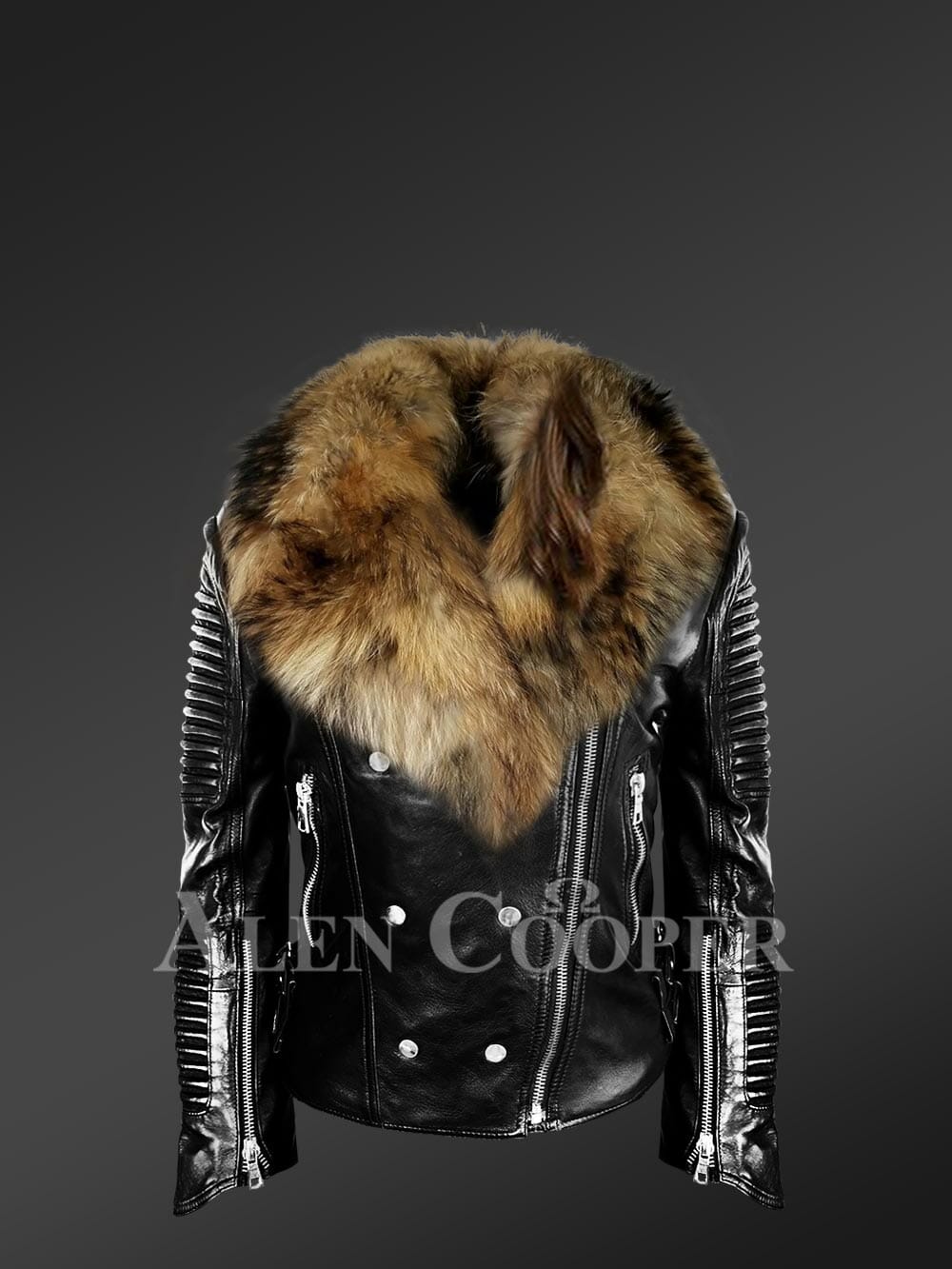 - Stylish biker jacket with a detachable collar of raccoon fur