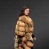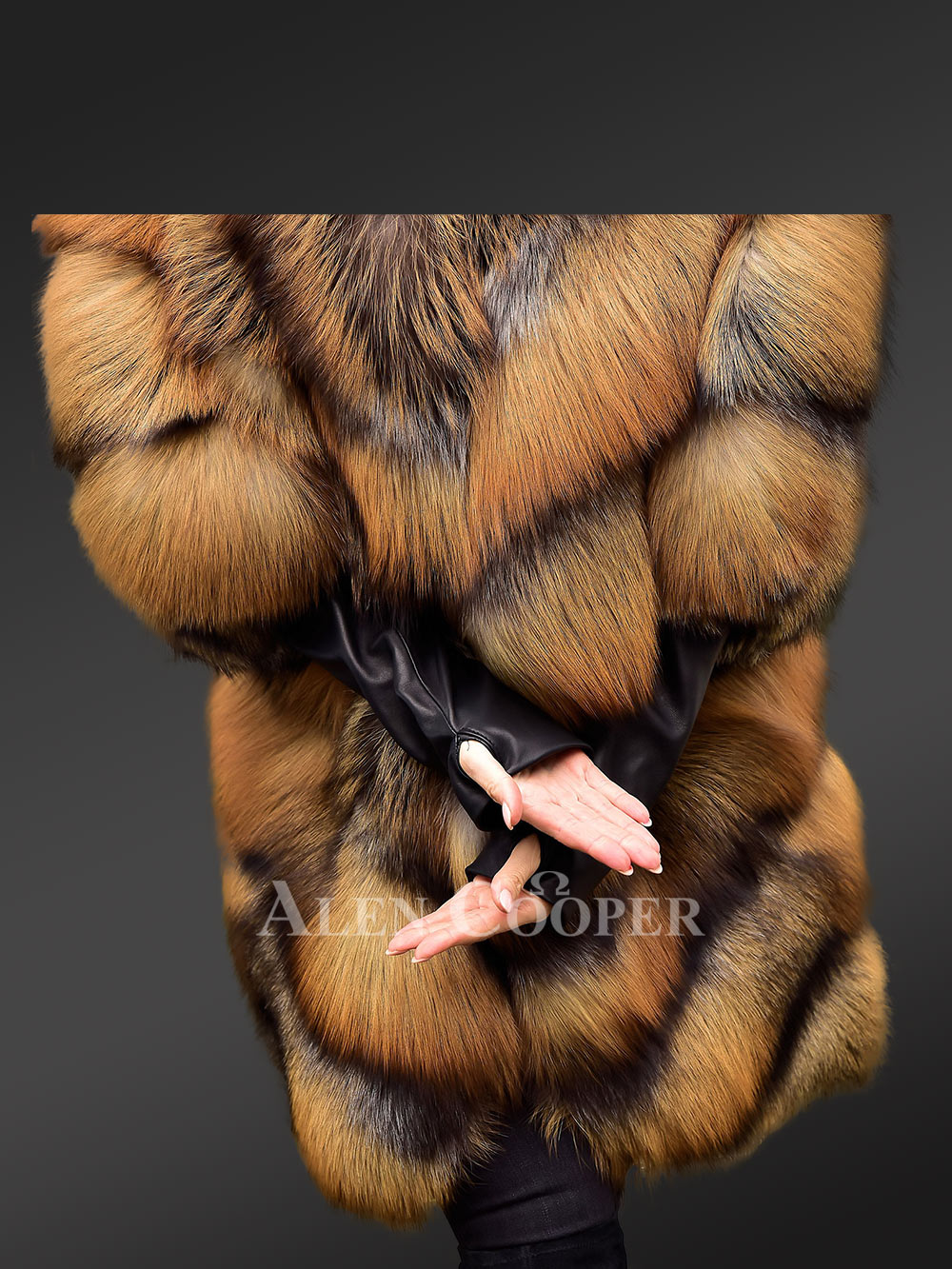 Swing coats tend to garner a lot of eyes as stylish winter wear. Alen Cooper has launched its swing coat made from authentic full-skin golden fox fur pelts. Having a fantastic color and quality, this Golden Fox Fur Coat is one of the most expensive and rare furs in the market. The V-shape Golden Fox Fur Coat has got a slanting pattern, both front, and back. The slant v-shape coat is plush winter wear that is dictated with golden, black, and white fur detailing.