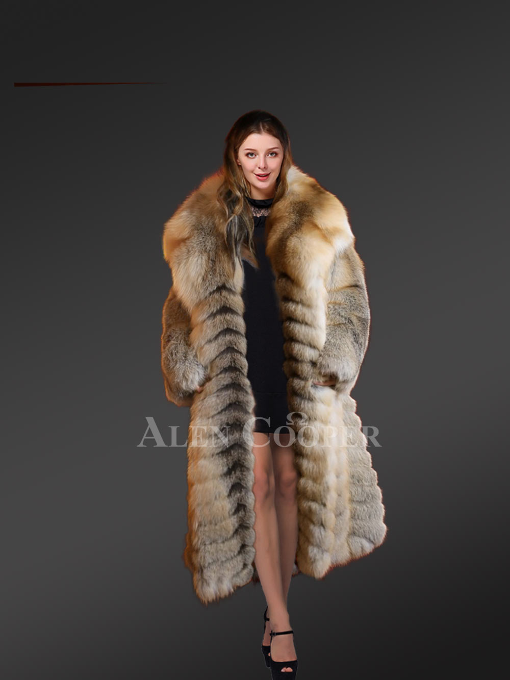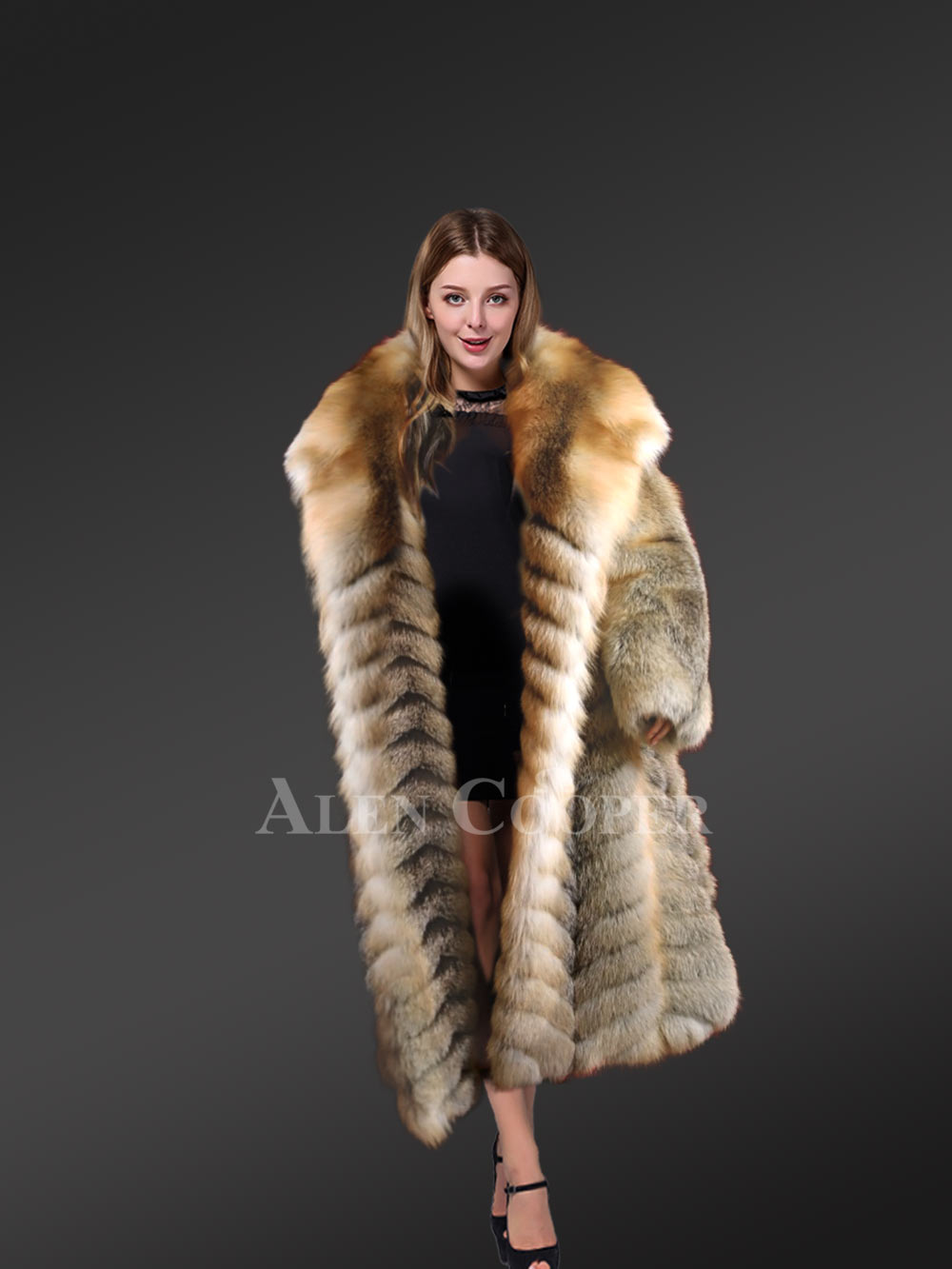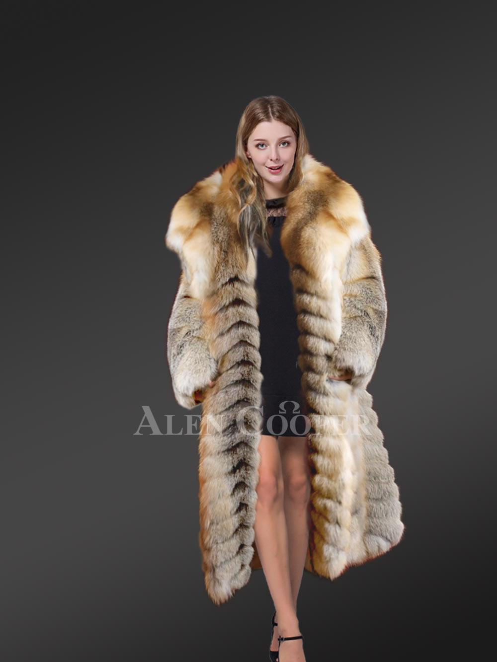 Delve into the magical world of Fox Fur Coats from Alen Cooper this winter. Keep looking your best while keeping toasty warm all through the festivities of cold winter in this Long Golden Fox Fur Long Coat.