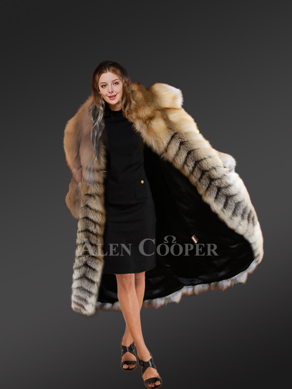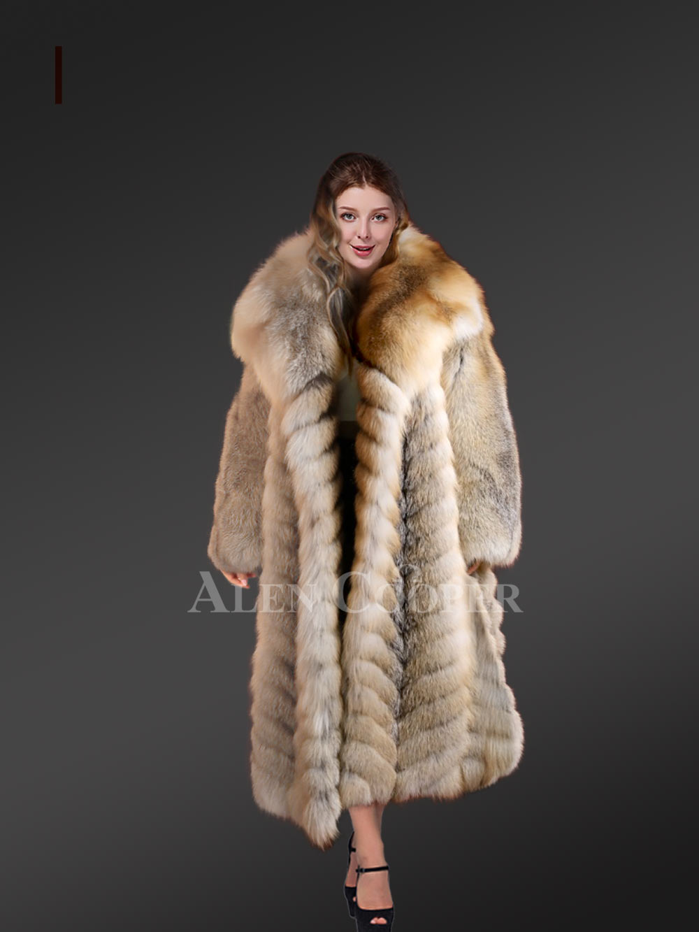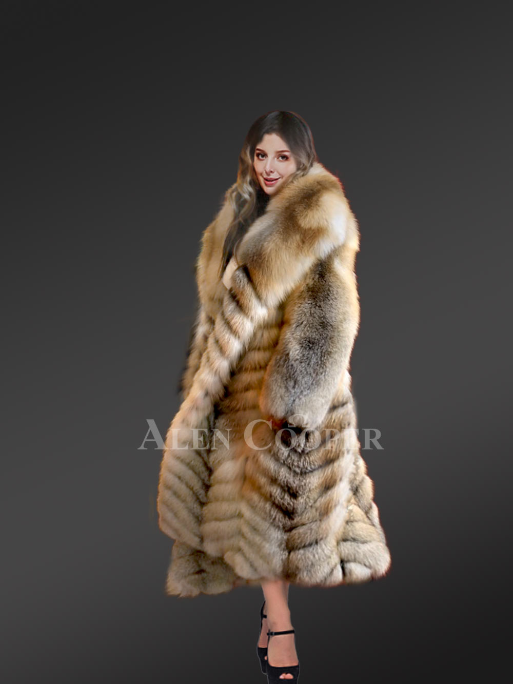 Delve into the magical world of Fox Fur Coats from Alen Cooper this winter. Keep looking your best while keeping toasty warm all through the festivities of cold winter in this Long Golden Fox Fur Long Coat.
