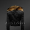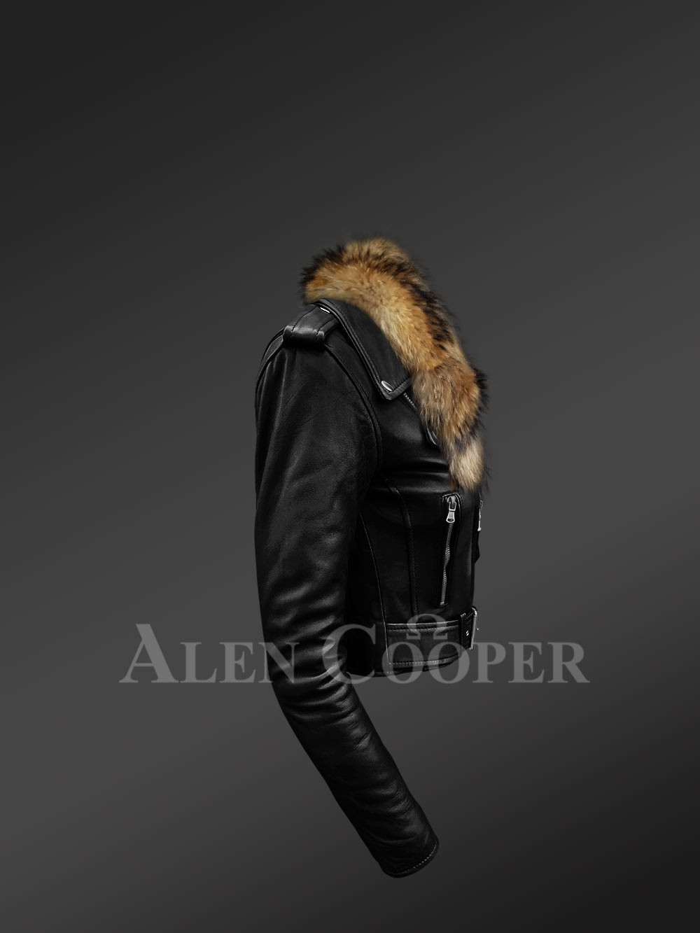 This High waist Biker Jacket is handcrafted and combined with a superbly tailored fit for an undeniably stylish appearance. For instance, the buckled belt around the waist enhances the fit, apart from adding a feature to the look. The again, there is an additional Racoon Fur collar that is detachable. So, the fur collar can be a part of the attire according to the event, mood or situation.