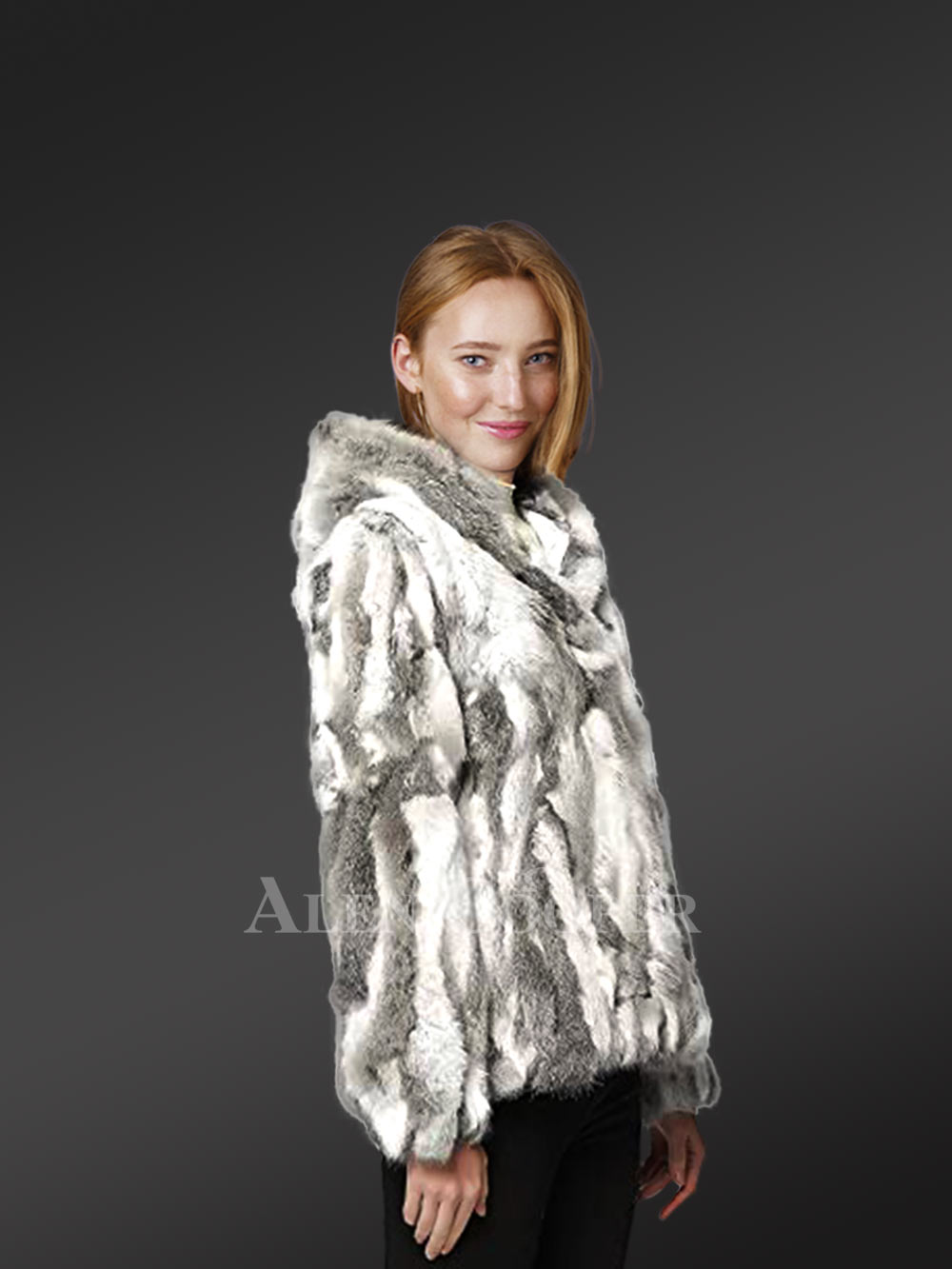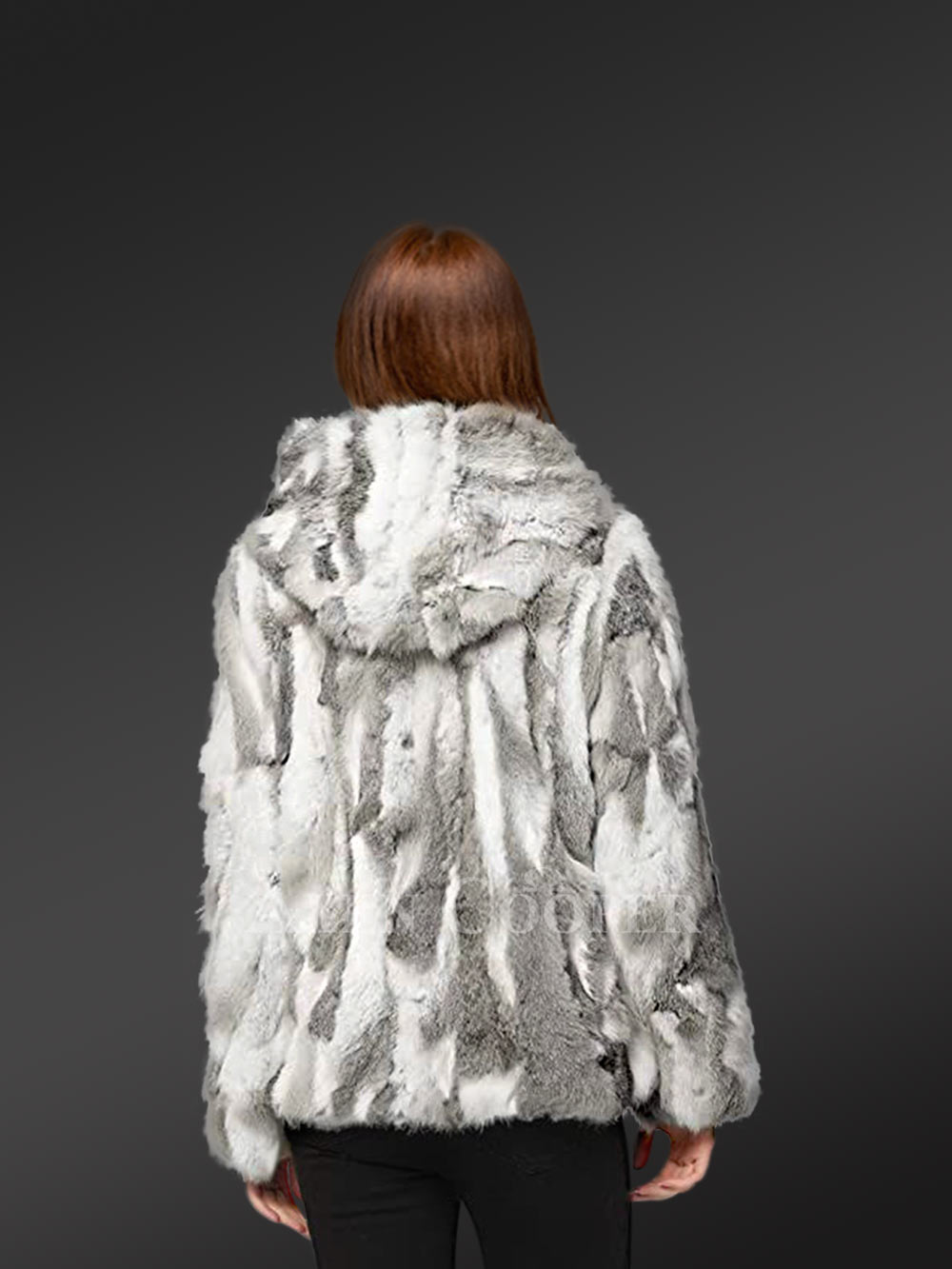 This Hooded Rabbit Fur Women Jacket offers the ideal combination between fashionable appearance and functional utility. Because of the colorful pure rabbit fur plates, this jacket is attractive, trendy, and fashionable. Further, the multicolor combination of the different shades of gray uplifts the jacket to high fashion.