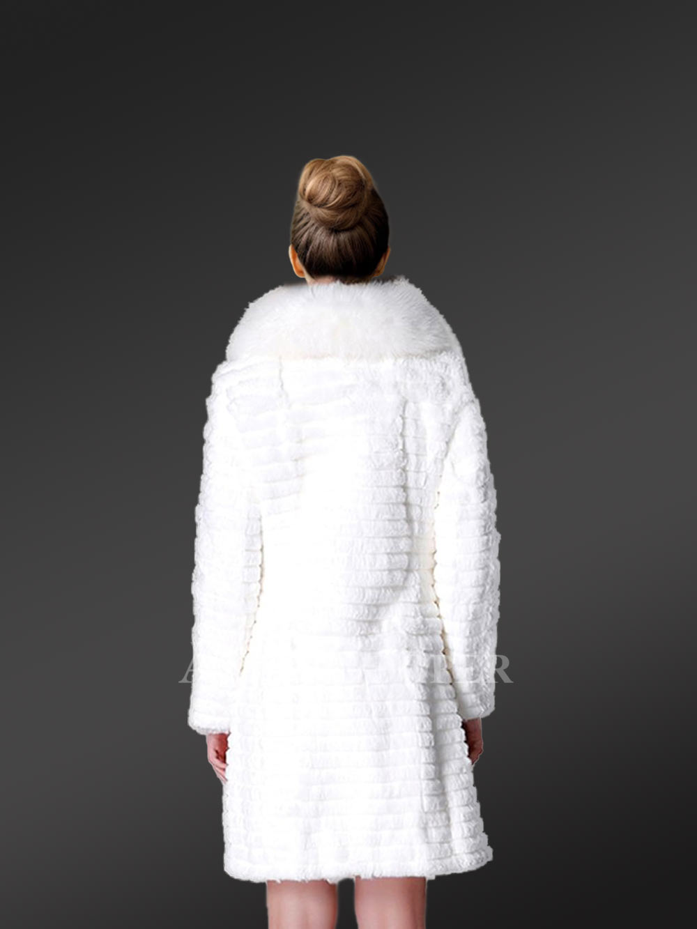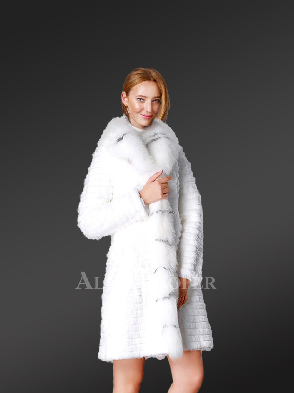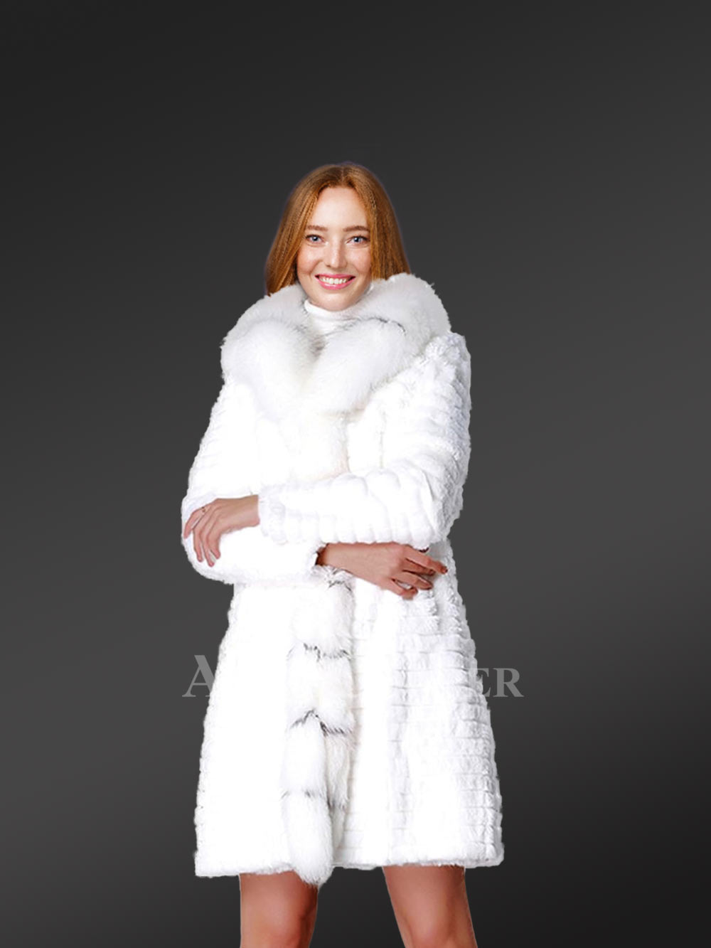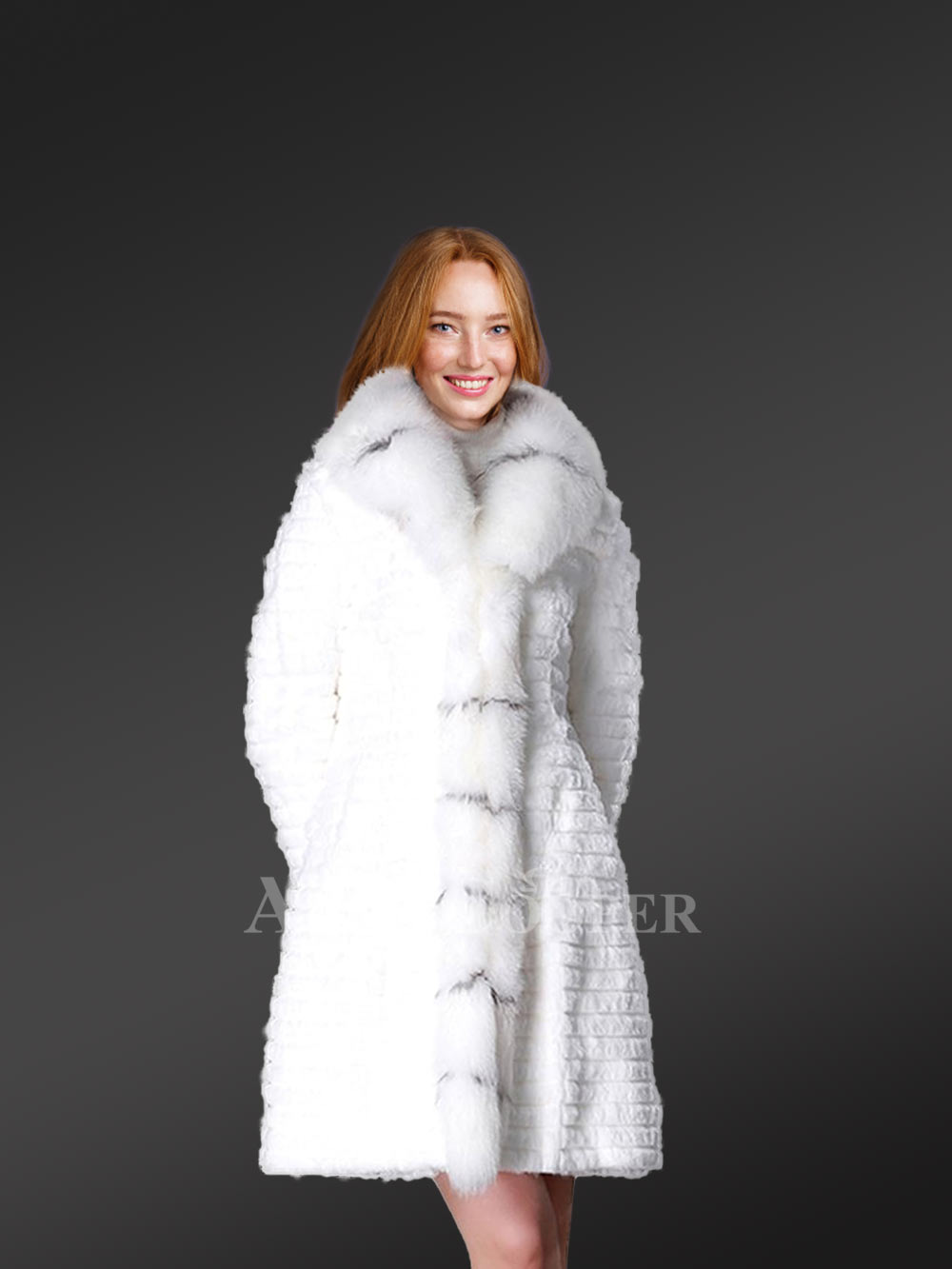 Horizontal Layered Rabbit Coat with Frontline Fox Trims in White