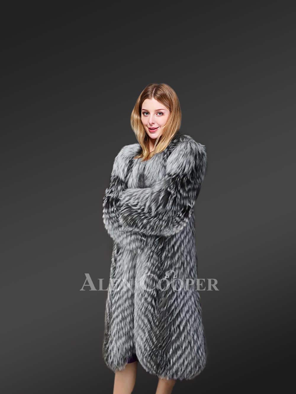 Delve into the magical world of Fox Fur Coats from Alen Cooper this winter. Keep looking your best while keeping toasty warm all through the festivities of cold winter in this Knitted Silver Fox Fur Coat for Women.