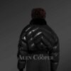 To enumerate, it has full sleeves with rib knitted cuffs and with overall parallel stitched detailing, looks authentic. Further, it has an exposed detachable wide Collar crafted with Original Fox Fur, is fluffy and dense in nature, makes the Jacket more appealing.  The black Fox fur is sourced from Denmark, Europe. The hairs on this fur collar is dense, soft and luxurious. This down styled filled Leather Bomber has puffy parallel stitches all over. The 100% duck down filling gives that extra puffy look and comfort while wearing this jacket.