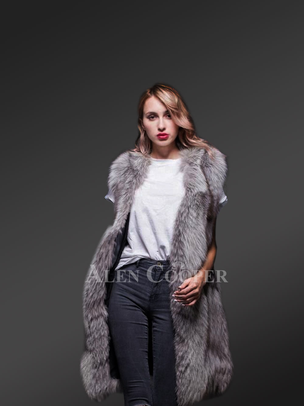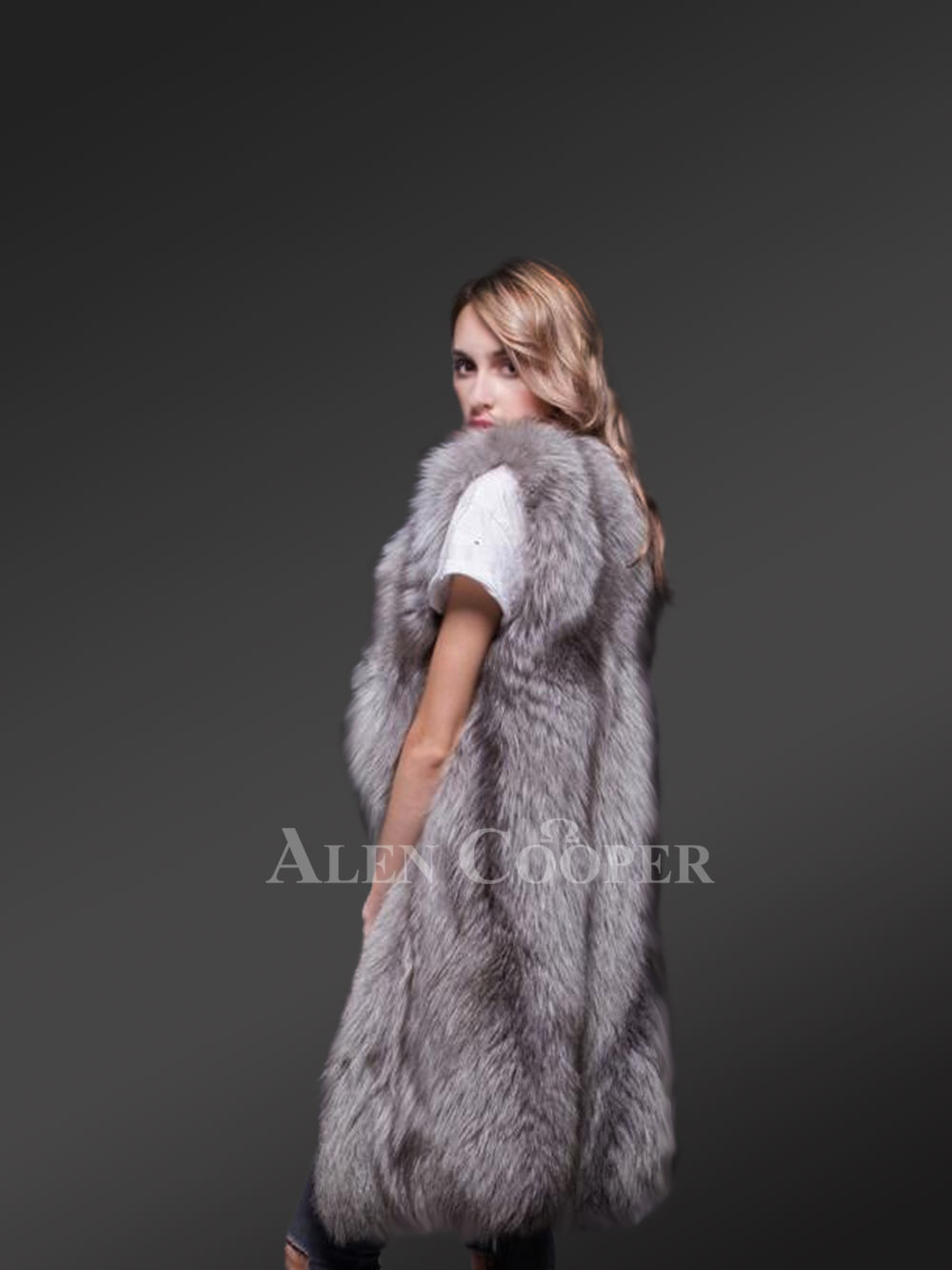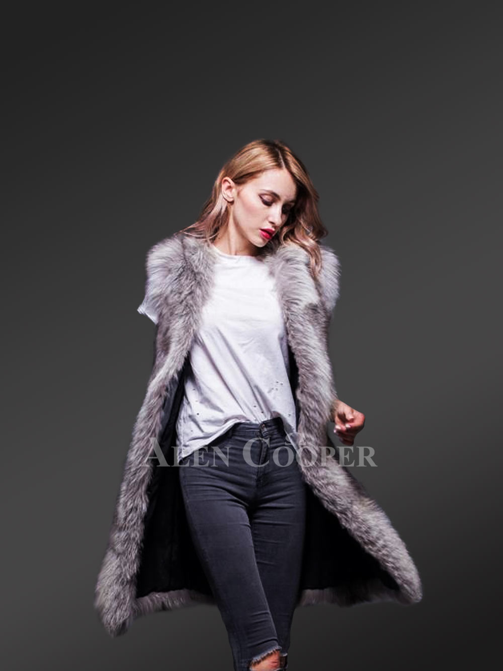 This plush winter coat effortlessly complements a woman’s look with its luxuriant authentic fox fur. Crafted with a lengthy knee-length size it engulfs the wearer’s body in extravagant warmth. It befits women suitably corresponding to their height and figure as an agreeable comfy wear. It elegantly matches denim and other variants of bottom wear like leather pants or linen trousers. Women can dressily team up this long and sleeveless fox fur coat with a full-length body con dress or even a long pencil skirt.
