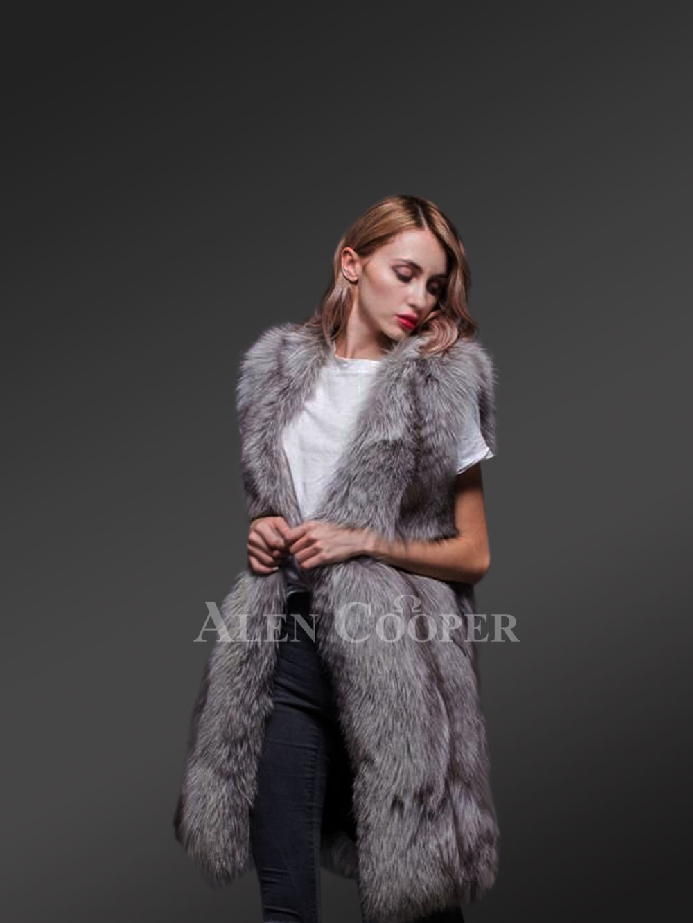 Make your winter evenings stylishly balmy in this long and sleeveless fox fur coat as a pleasant thermal couture. Although it carries a casual lightweight feel it adequately safeguards the wearer from frigid times. The insulating quality of real fox fur pelts keeps one well-guarded from harsh to mild coldness. The butter-soft texture of real fox fur assures snugness combined with a toasty feel throughout the wear. Alen Cooper presents this sleeveless coat in a classy grey shade that readily matches the party ambiance or a social mood with perfect élan.