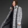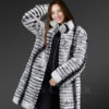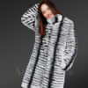 This stylish, furred piece majestically fends off the frigidity of winter weather courtesy of its warm, authentic Rex Rabbit pelts. This classy knee-length coat as a sustainable winter fashion captivates the view at any event or party. The stunning striped pattern in black and grey shades creates a sublime visual impact on the onlookers. The premium fur quality and the distinctive motif effortlessly magnify its pristine charm. In addition, the intrinsic satin lining comforts the wearer as an added layer of soothing fabric. Women can wear this lightweight apparel even during daytime events without any uneasiness.
