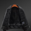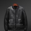 Designed by hand, the stylish Shearling Real Jacket features elasticized mandarin collar, cuffs, and waistline. Further, the implementation of the elastic ribs has created a different style statement for the distressed black jacket. Adding more to the creativity and innovation, the highlighted part of the outerwear is the Nappa finish box-style pockets. However, they come with flaps with snap buttons on them.