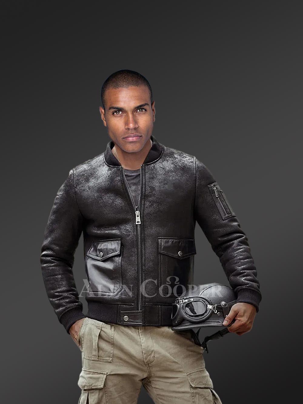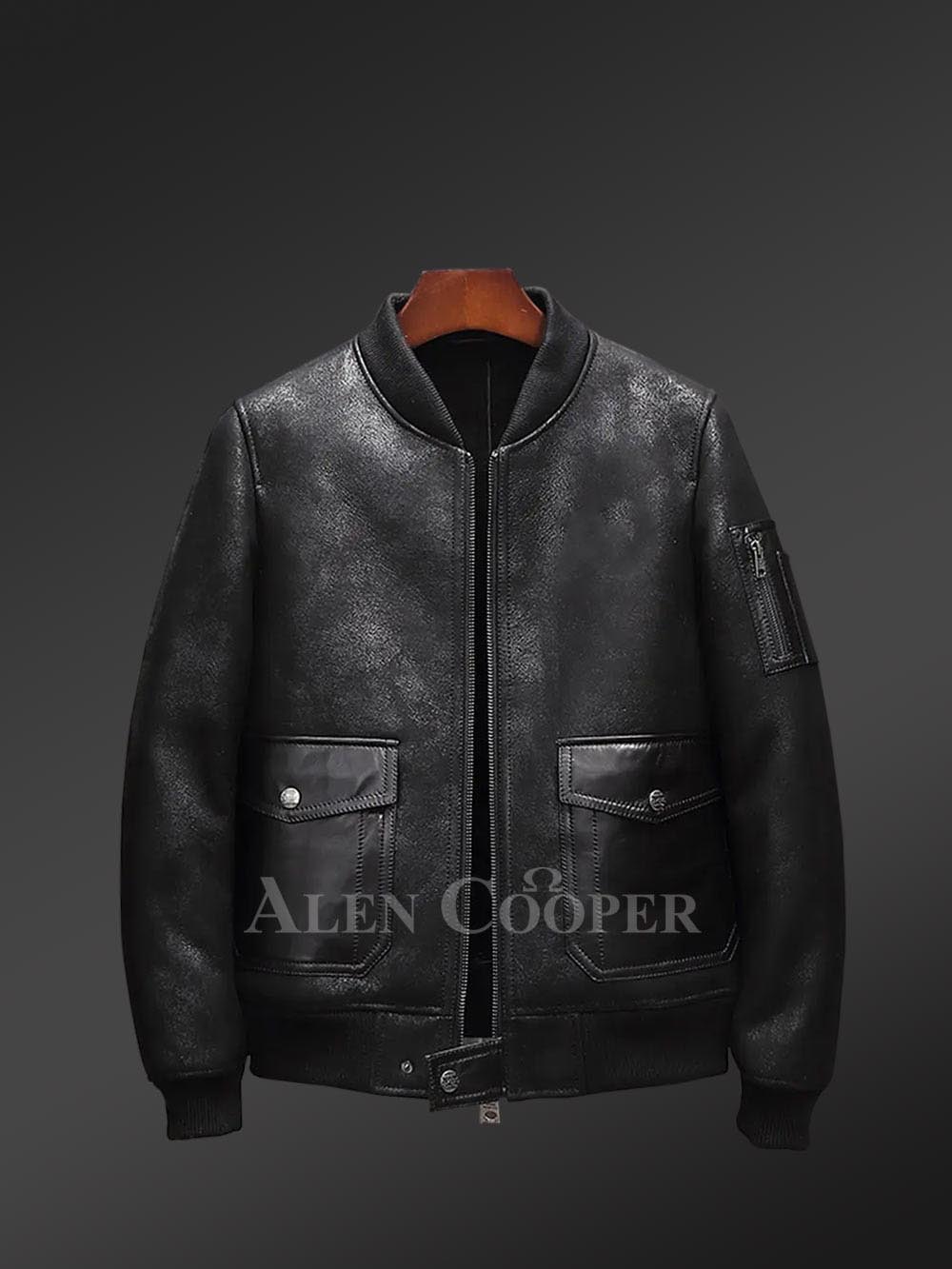 The stylish outlook of distressed jackets is gaining new peaks of popularity. The popularity is more when the color of the Men Real Shearling Jacket is black. By all means, the product line is made from authentic pelts of shearling or lambskin. Comes with a suede finish, and the chic wear is soft and supple in texture.