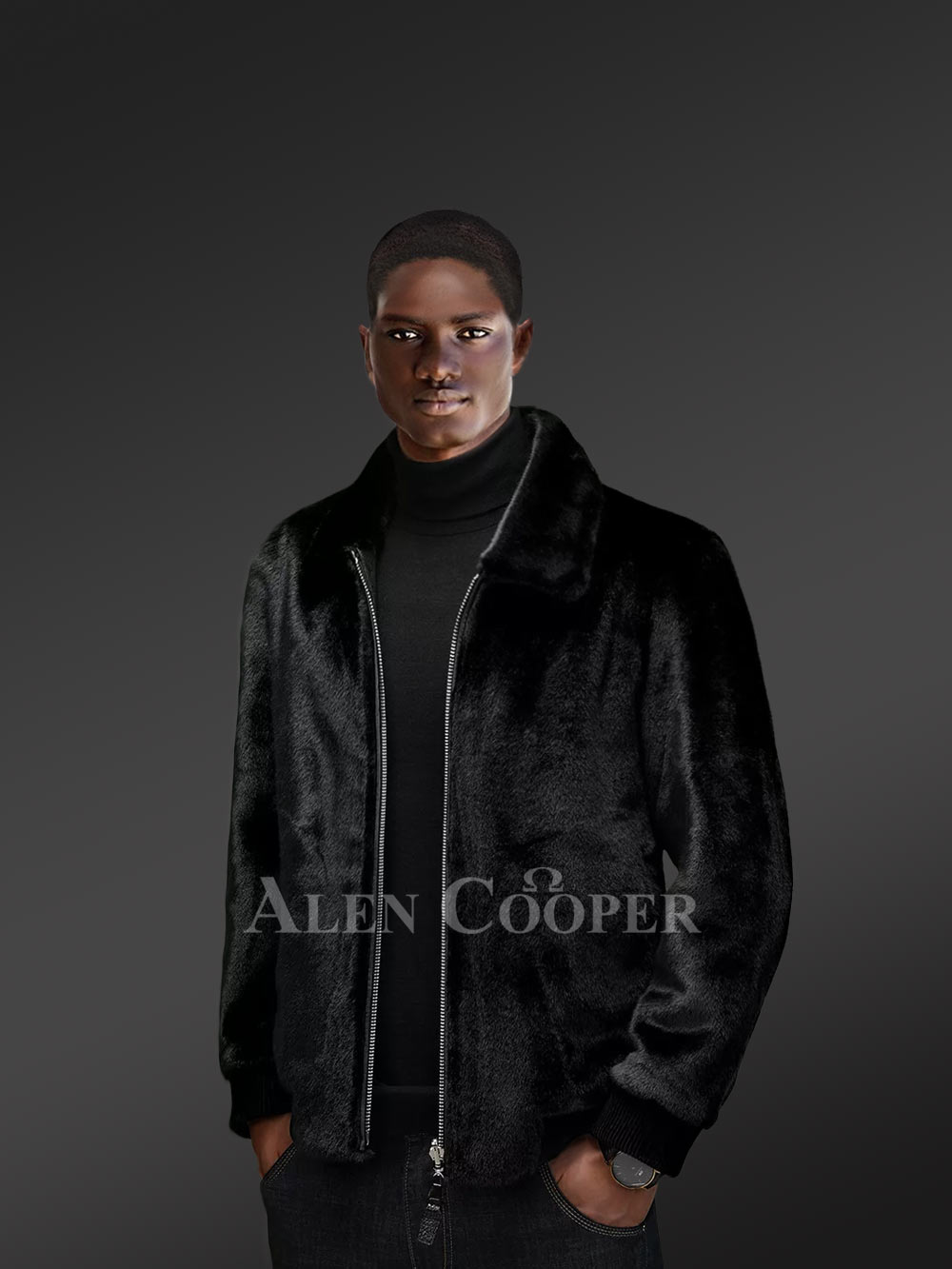 - Classy black bomber jacket of premium mink fur designed to fit comfortably