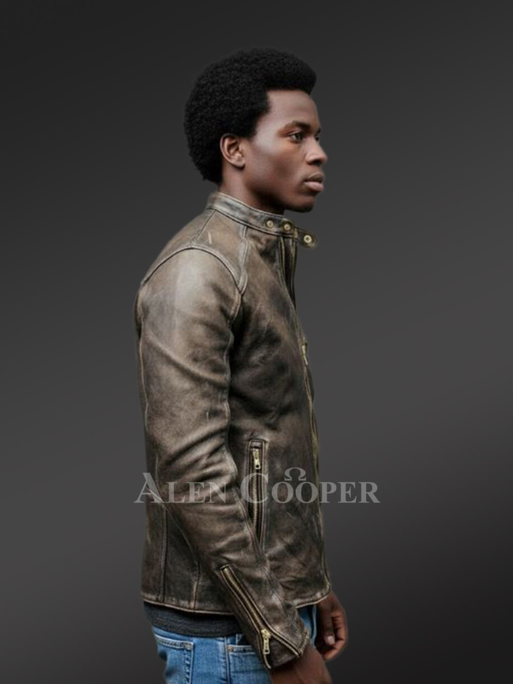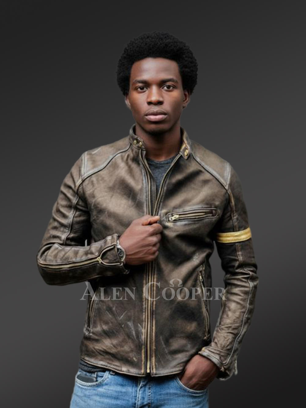 It’s hard to deny the unique aesthetic appeal of distressed leather. On that note, this deluxe leather jacket certainly revives the memories of 70s and 80s. Its vintage appearance indeed accentuates its ruggedness and can instantly elevate the looks of any man. The yellow band of leather accentuating the upper portion of the left sleeve looks charming in contrast to this outfit’s unique brown shade.