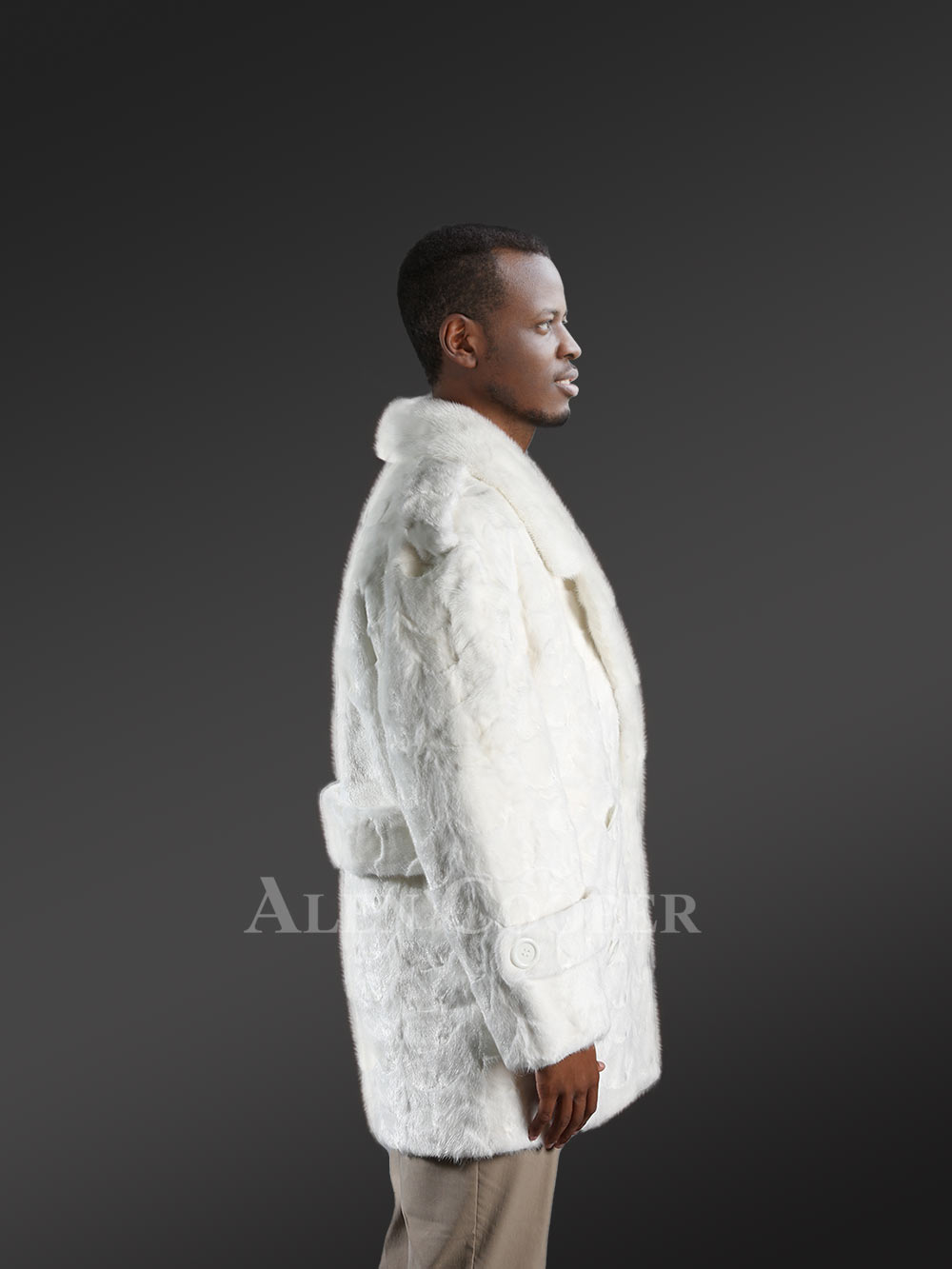 - Luxuriant pea-coat of mink fur looks magnificent in pristine white with distinctive wavy texture
