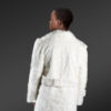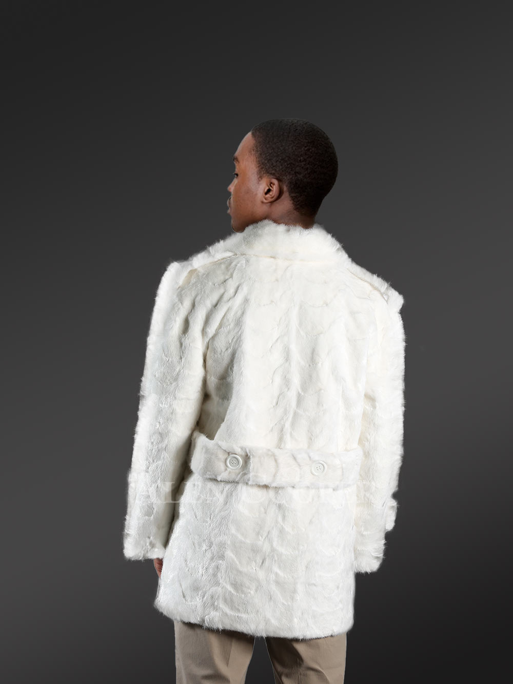 A buttoned wide band of mink fur also highlights the backside of the coat in the middle looking like a modish belt. The satin lining offers a pleasant feel to the wearer along with the mink fur which feels incredibly soft to the touch. The breathable natural fur also offers a feeling of freshness and the coat never feels too hot to wear. This lightweight outfit is equally comforting to wear during outdoor activities whether it’s an outing, a long trip or outdoor party. This white pea-coat can be beautifully paired with the lighter or brighter shades of any color on the palette. Thus, the styling options are limitless for this coat. One may pair it with a large variety of bottom-wear and top-wear for men.