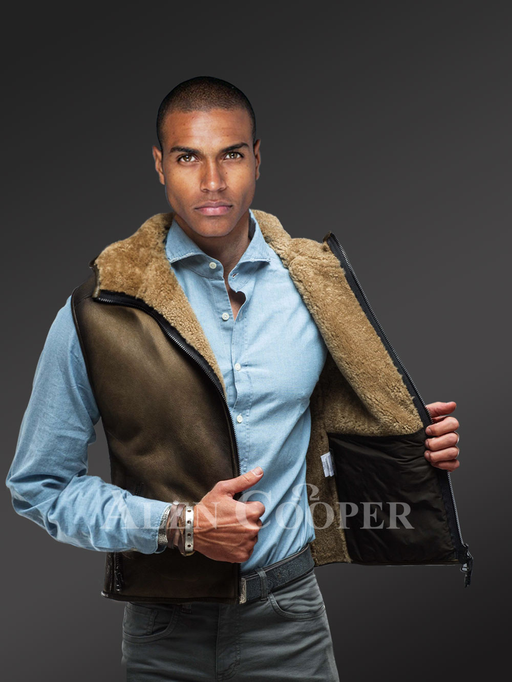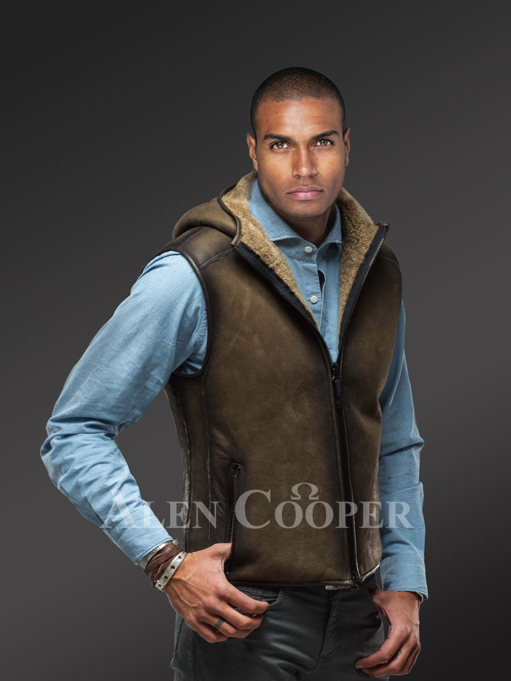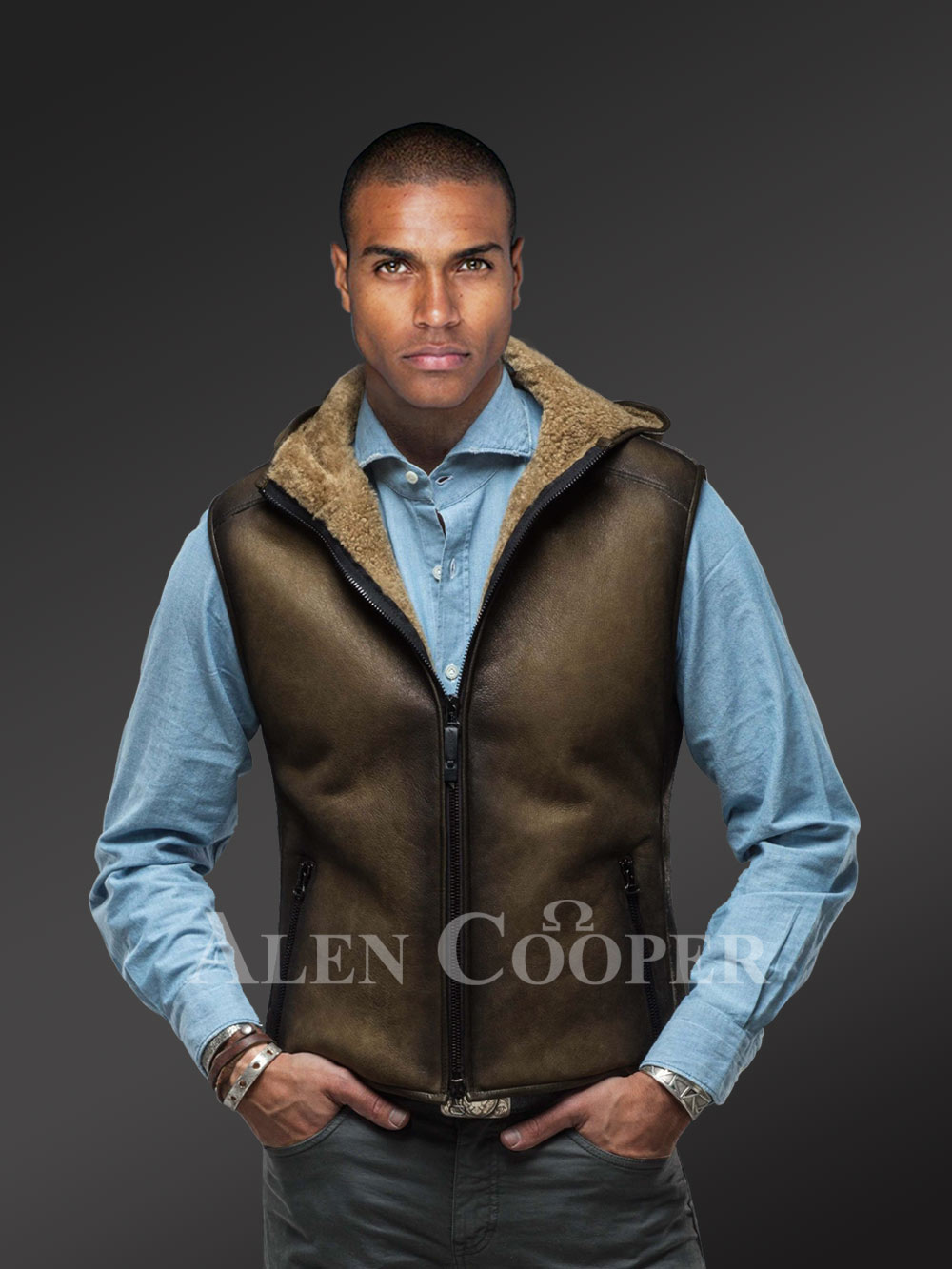 Made with care, caution and precision, the shearling vest showcases unparalleled style and elegance. Not just that, the vest comes with a hood area with that dual rub off finish on the body. The inside of the hood as well as the collar area is well decored with the sheepskin woollen layer. The inner woollen layer of the sheepskin is flipped and exposed to those areas.