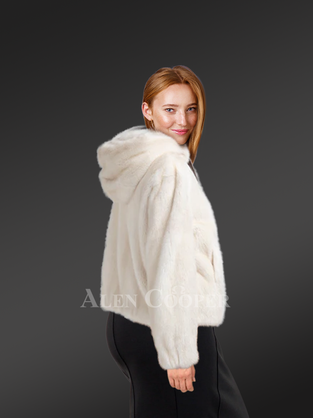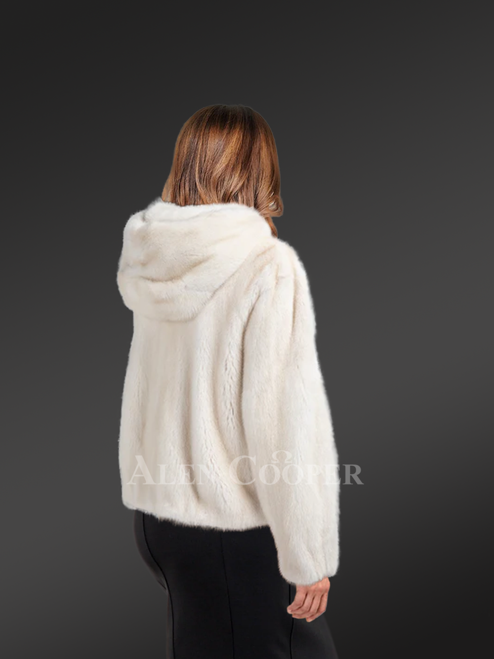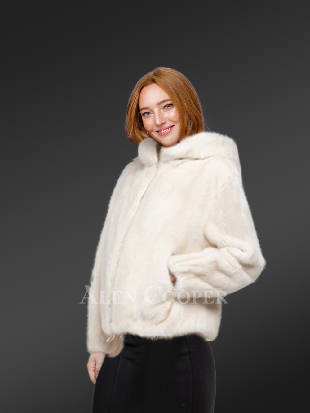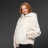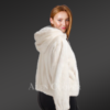 This womens mink bomber with hood is an alluring piece that instinctively mesmerizes one’s glance with its serenity and smooth texture. Its soft uniform appearance demonstrates the usage of natural mink fur in its finely detailed crafting process. Alen Cooper efficiently adds this newly launched warm wear to its exquisite product range for women. Skilled craftsmen use natural full-skin mink pelts in designing this furry wear. The premium quality of authentic fur furnishes pleasant warmth to the wearer with restfulness. The inside of this jacket provides a velvety satin lining for a soothing feel to the wearer’s body. The immaculate snowy white shade makes this beautiful jacket an outright head-turner at any social event or fest.