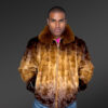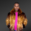 Mink Fur Bomber Jacket with Fox Collar for Men in Golden Dark Brown Contrast