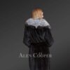 The shawl-style collar of fox fur is certainly a glamorizing feature of this outfit. Additionally, it provides the neck as well as the front side with a warm layer of fur. The voluminous fox fur collar looks stunning against the black background of the sheared mink fur because of its natural color combination.