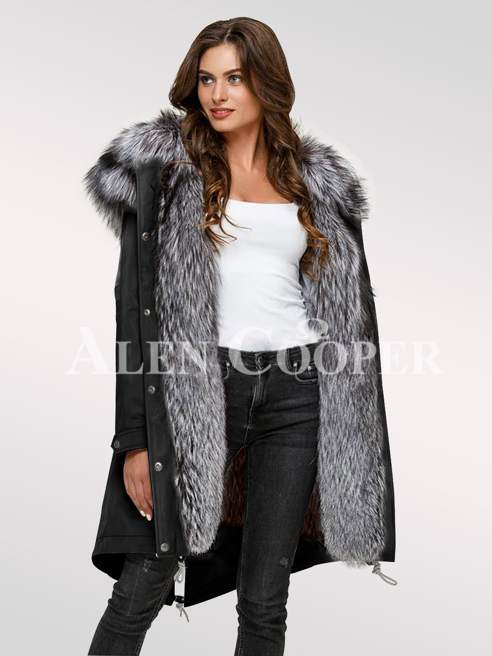 An amazing range of Scandinavian silver fox fur hybrid black parka convertibles for women crafted with immense innovation and care is calling shots in the fashion world. It has a rich work of fur along the trim of the hood and the frontline that simply arrests attention. Thus the product line is ideal to make the centre of attraction in any crowd.
