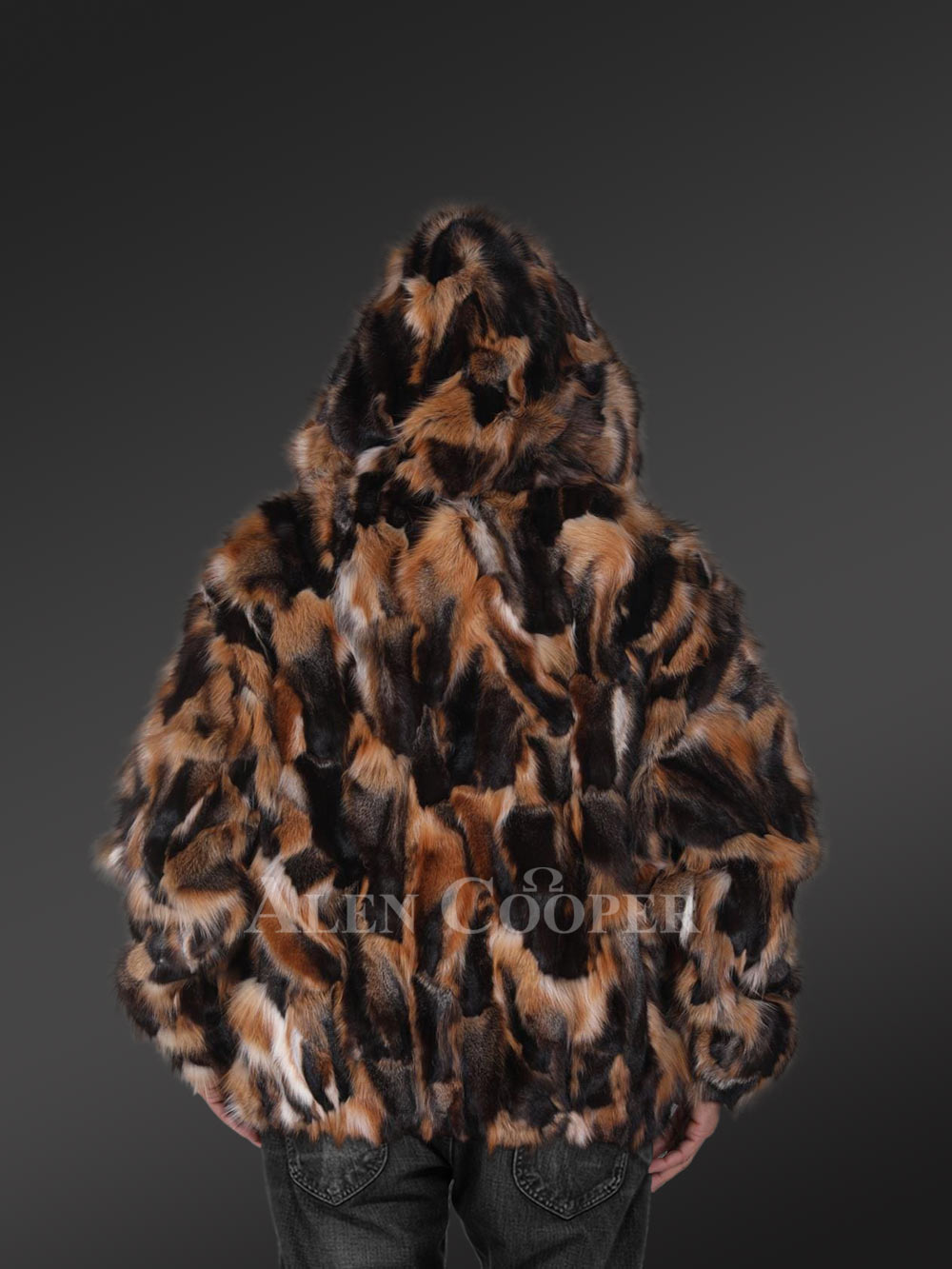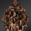 Accomplished craftsmen have designed this fox fur multi color bomber jacket using sections of fox fur around it. The bomber style makes it a modish attire along with its insulation features that shield the body from cold weather. The elasticized cuffs and hemline offer a snug fit to the wrists and the waist thereby furnishing sufficient warmth to the wearer. The broad turn-down collar with fox fur hood provides incredible warmth to the neck and the head against the freezing weather. This furry wear also features a velvety soft satin lining on the inside adding a pleasant feel to the skin. It has a waist-length size with two slit pockets on either side. These pockets keep both palms warmly covered and also provide space for some essentials. It is available in all sizes for men and can be suitably paired with leather pants or jeans.