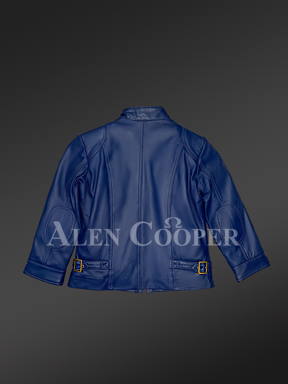 This luxurious jacket is made from genuine leather and features a soft Napa finish in navy blue. This outfit is always stylish and trendy and the funky color will only add to the charm. The long sleeves of the blue jacket have eye-catching elbow patch detailing. The stitch detailing on the shoulders is guaranteed to turn heads. The short, waist-length jacket with sturdy blue side belts at the hem gives it a snug fit to keep the child cozy this winter. The beautiful half collar with a belt and buckle is practical and makes the jacket look fantastic. The jacket’s smooth stitch detailing on the sleeves adds visual appeal to the exterior. The inner lining’s luxurious quality will boost comfort. The front-open jacket has superior, chrome-finished zippers set centrally to provide the best insulation possible along with the strategically placed belts and fitted waistline and cuffs. The back and two side seams provide much ease of movement. The two side slash pockets’ layout blends comfort and style and can be utilized to shield exposed hands from the brisk weather. One can use the other 2 vertical straight pockets with flip and button closures on the chest to store little items for oneself.