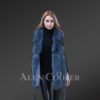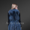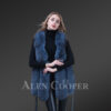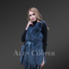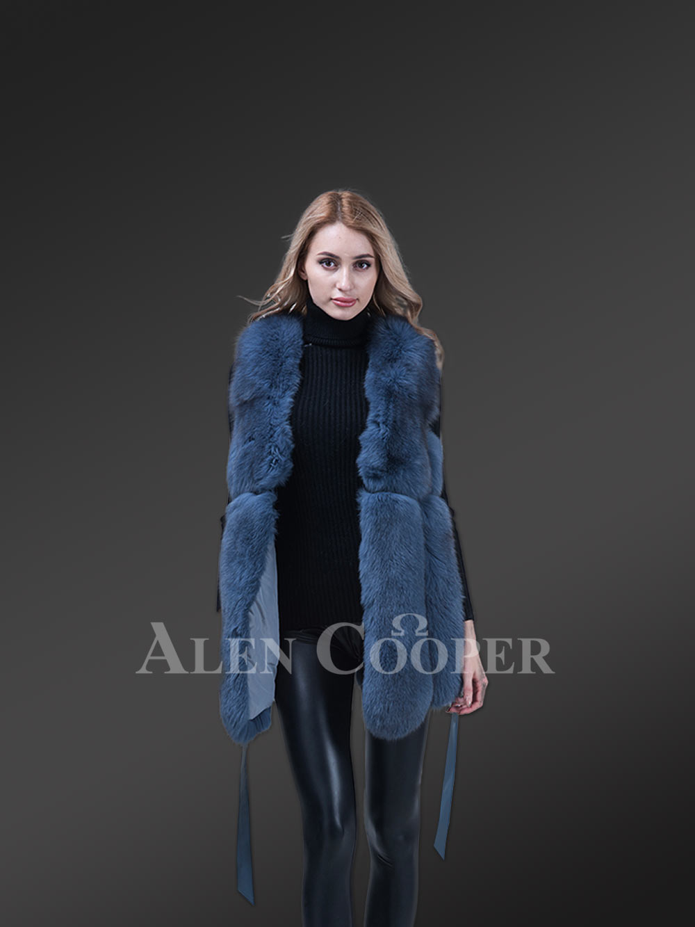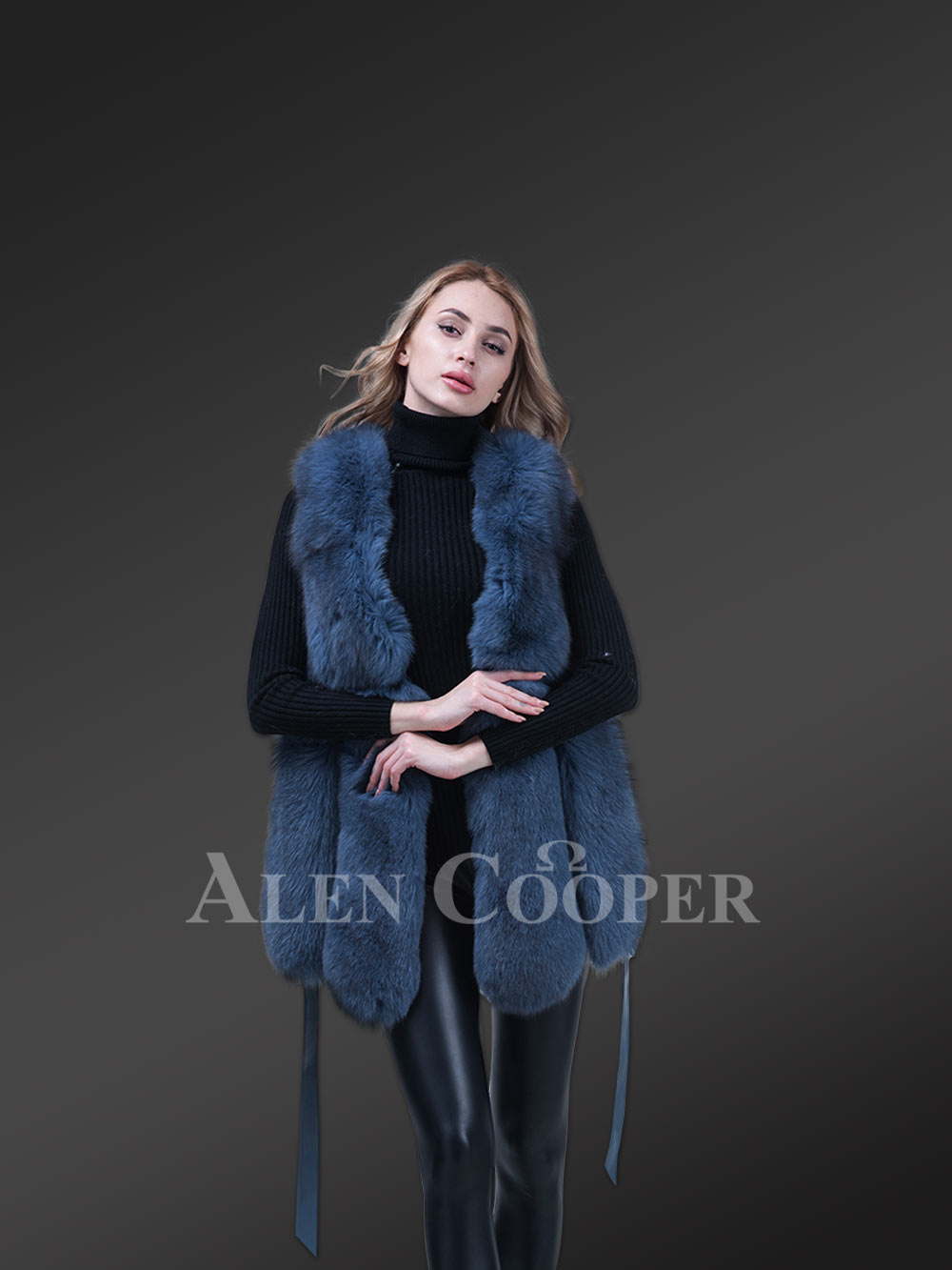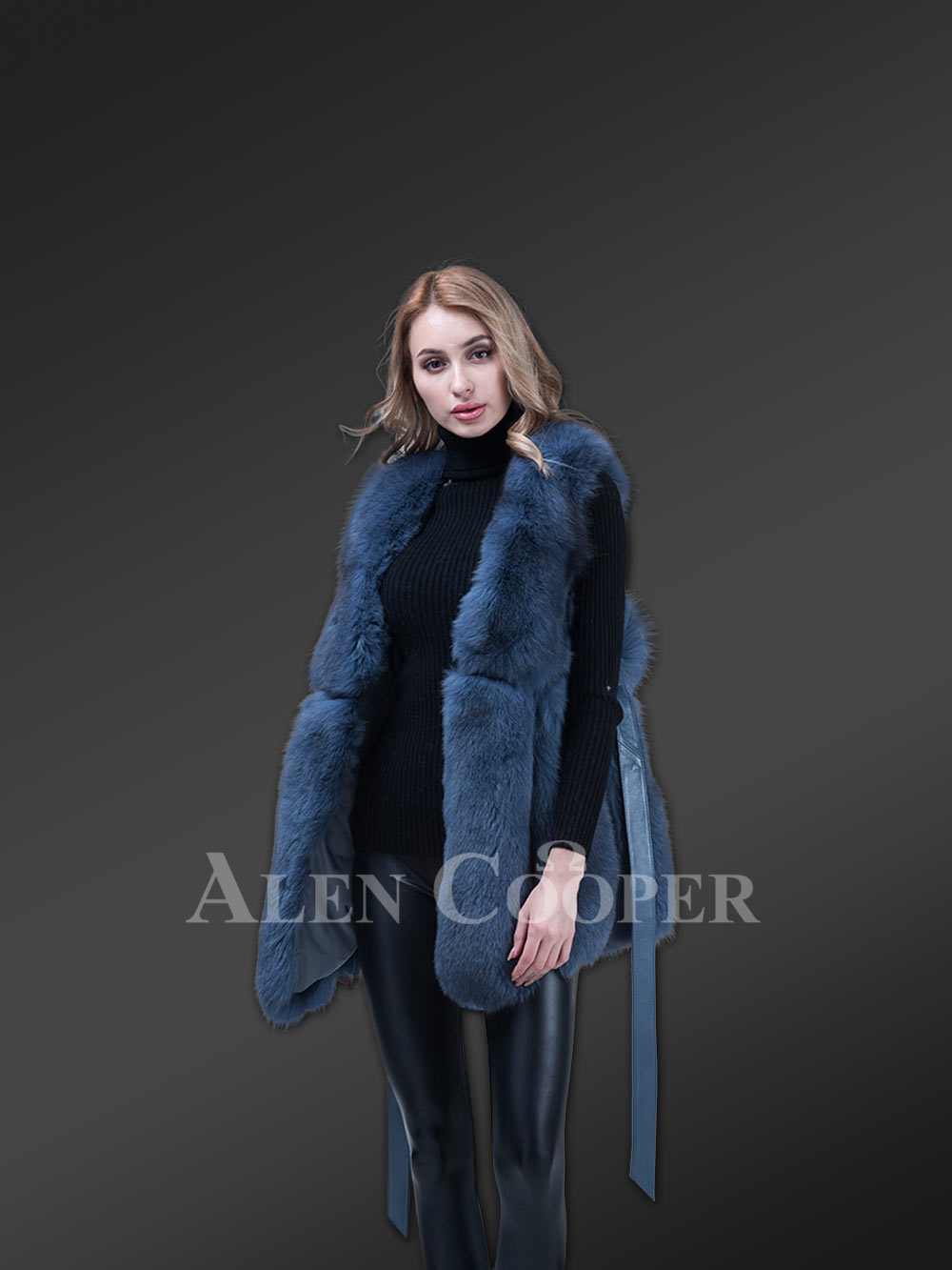 Parallel fox fur pelts are co-joined in crafting this real fox fur womens vest with majestic appeal. Excellent tailoring being a functional feature of this outfit immaculately shines through its fashion avatar. The premium quality of fox fur pelts produces a fluffy form accompanied by a soft and smooth texture. A blue colored leather belt at the waistline snugly embellishes this plush wear as a key feature. The alluring pockets on either side help the wearer keep her palms in spacious warmth. It also features a hidden closure therein offering insulating comfort during cold weather conditions.