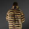 Both the hemline and wrist border carry stretchable yet tight elastic concealed bands, pulling in warmth. Further, the sides of the front carry slit pockets which facilitate the state of comfort while outdoors. Without a doubt, the Bomber in Rex Rabbit Fur is an opulently elegant option for men, which with this intention of remaining evergreen in its sheen has been skillfully designed. It exudes the sublime charm of the gorgeous paragraph sections, the texture that compliments the blend of whiskey and black shades throughout the body. All in all, the body emits the glaze of chinchilla look finishing of rex rabbit fur.