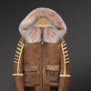 It features a distressed suede finish with a collar & a hood made of premium quality Arctic Fox Fur. While it may be true that the fox fur hood is an added zip-out feature that keeps you more comfortable on chilled days. However, the jacket is tailored waist-length. Also, there are two side pockets in vertical orientation. Moreover, flap covers aid the closure.