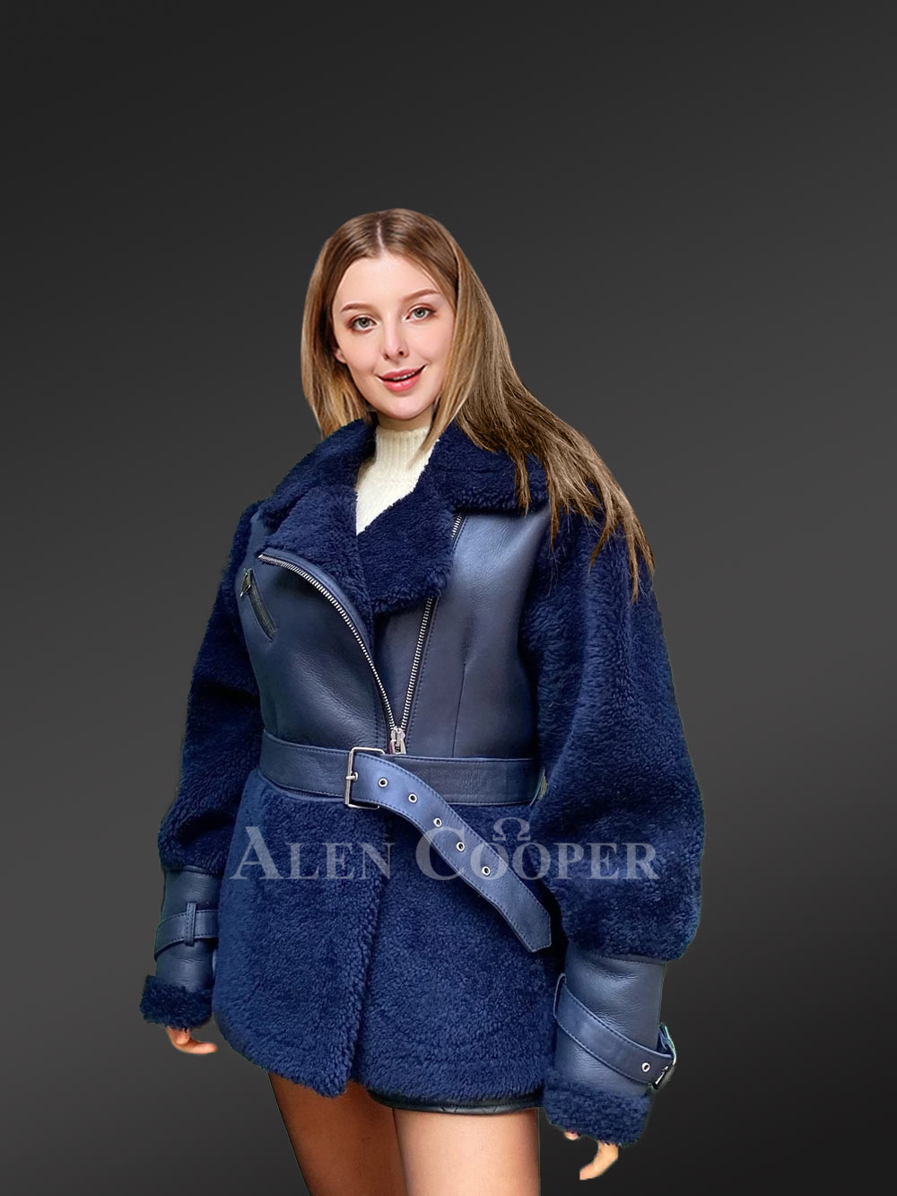 Authentic sheepskin leather is perfect for the cold and provides warmth while minimizing wrinkles. This Sheepskin Shearling Coat Women in Royal Blue from Alen Cooper is ideal for extremely cold weather conditions. Further, this jacket is made of premium royal blue tanned shearling and has a smooth finish that is hypoallergenic and very soft on the wearer’s skin.