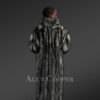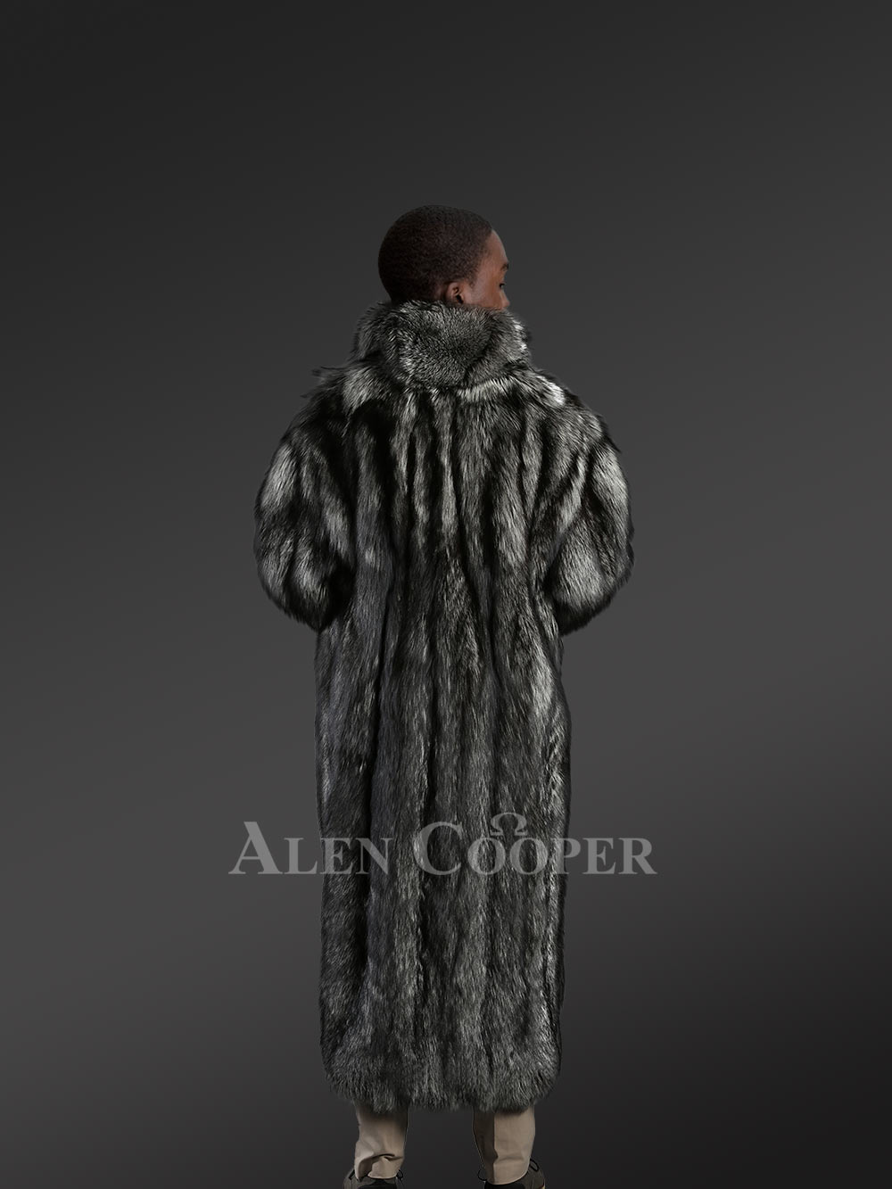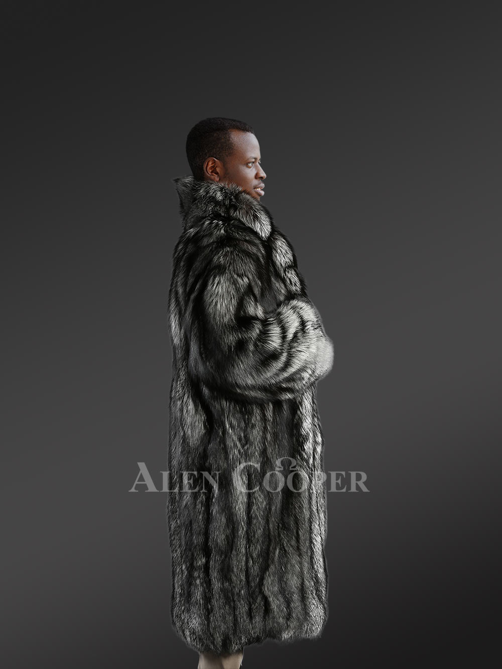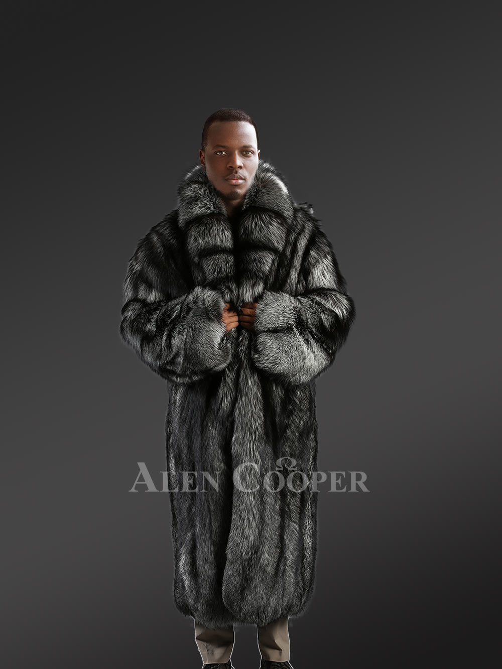 This dapper-style men’s silver fox fur trench coat is perfectly suitable for any social gathering during winter festivities. This deluxe winter outerwear from Alen Cooper efficiently uses natural, full-skin pelts of silver fox fur. Its unbeatable snugness packed in adequate insulation highlights the magnificence of real fur. It not only provides maximal warmth to the wearer during the cold winter months but also sufficient breathability when worn for long hours. Its interior body is furnished with premium quality satin lining for a pleasant feel to the skin. Its captivating appearance of black shade with silver speckles readily fascinates anyone’s view. Its trendy look makes it a perfect pair for dressy trousers, leather pants, or jeans.