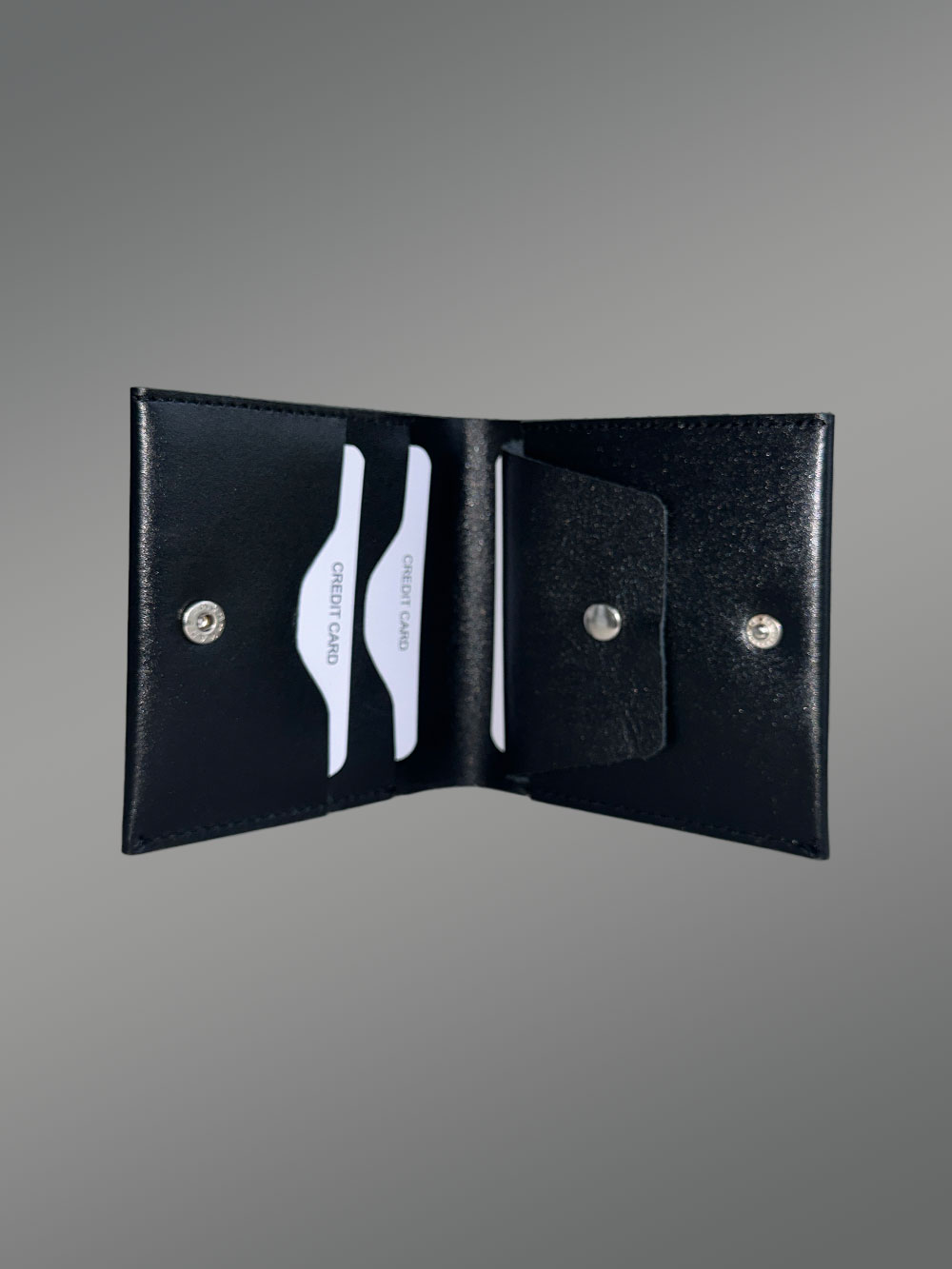 - Simple manageable bi-fold wallet in a monotonous black color with a press button locks.