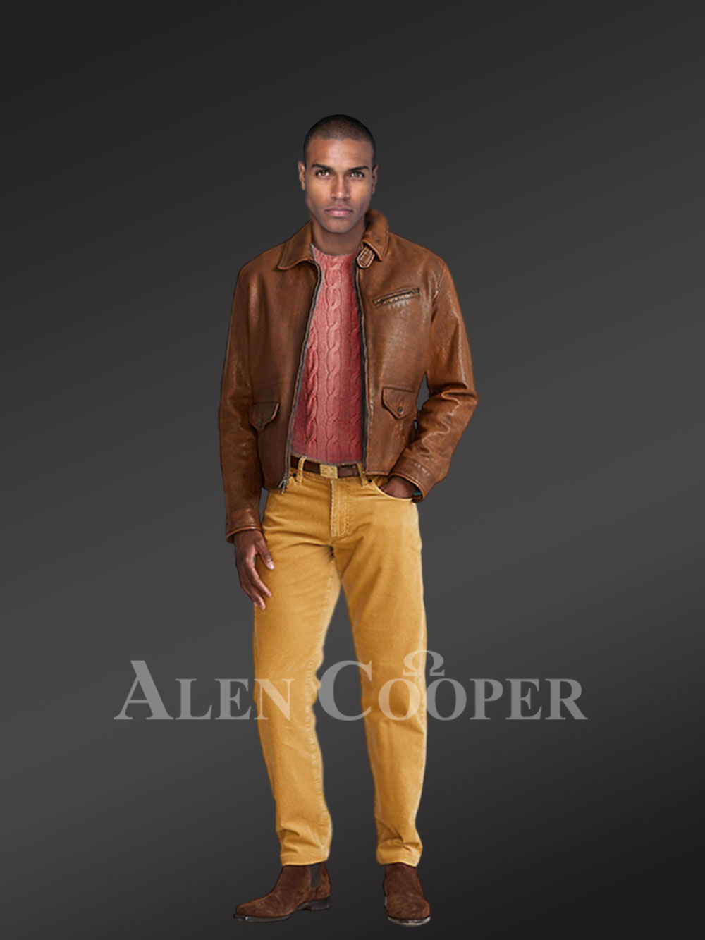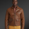 This jacket structures 100% pure leather which is hued a brown shade. More specifically, the shade is raw sienna shade and is very appealing. The jacket reflects a stylish aura and has a comfortable texture. It provides adequate warmth for the winter.