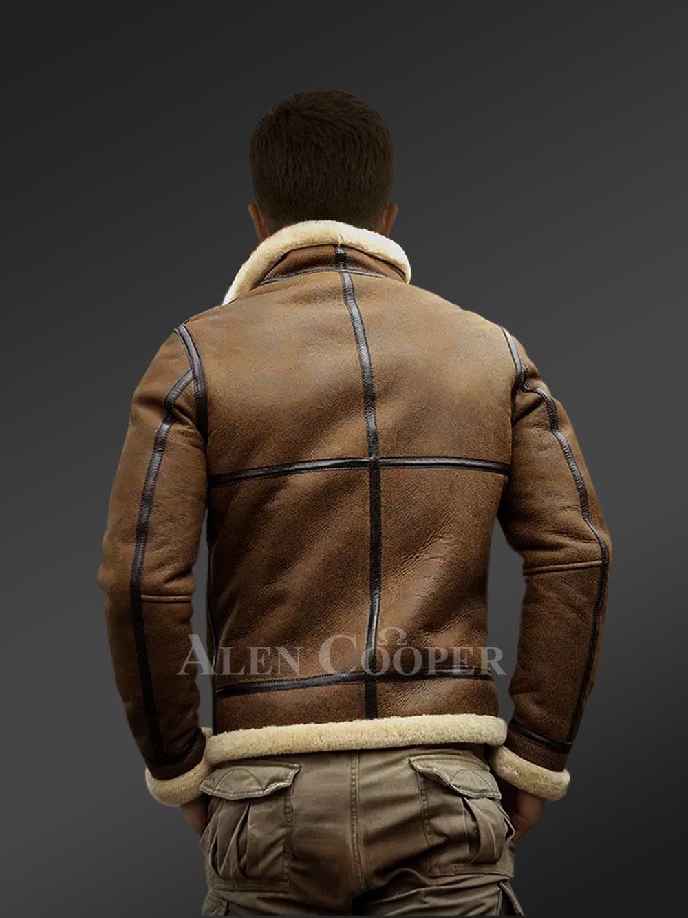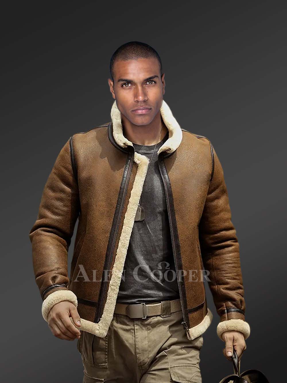 Shearling Bomber jacket for men looks impeccable with practical functionality and natural wool finish all over. The tan-brown Shearling Bomber jacket is curated from authentic pelts of shearling or lambskin. Soft and supple in texture, the shearling jacket for men offers sufficient warmth and insulation even in extreme cold.