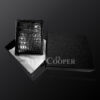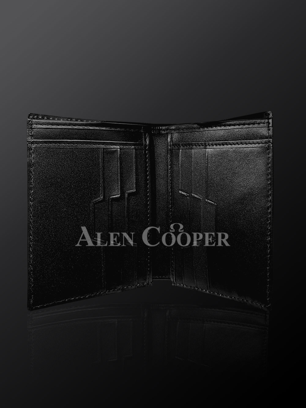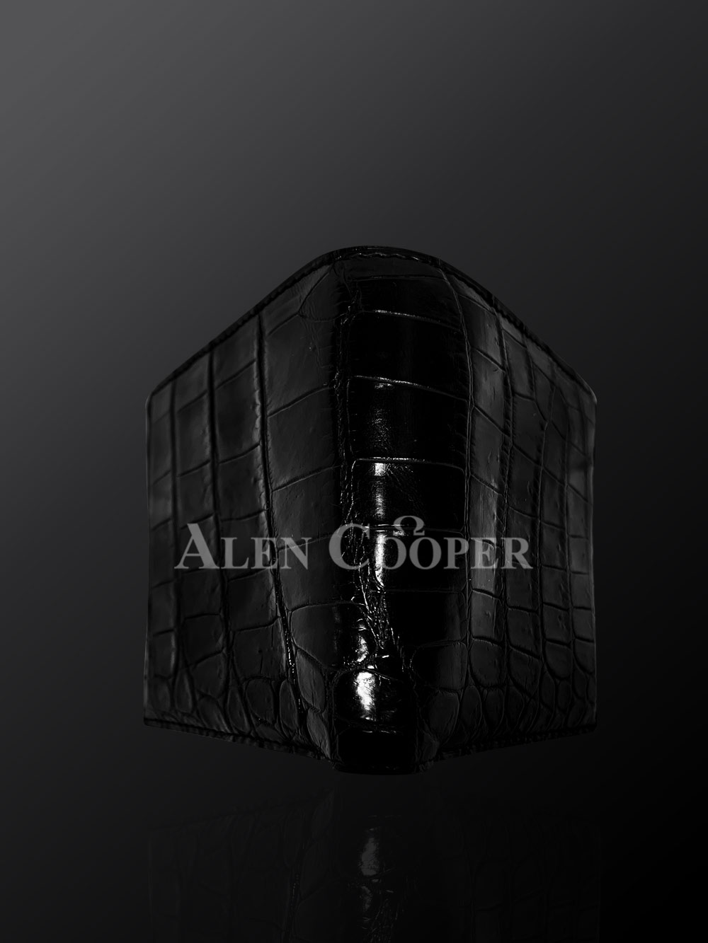 - The stylish black leather wallet is made from the authentic plates of alligator skin