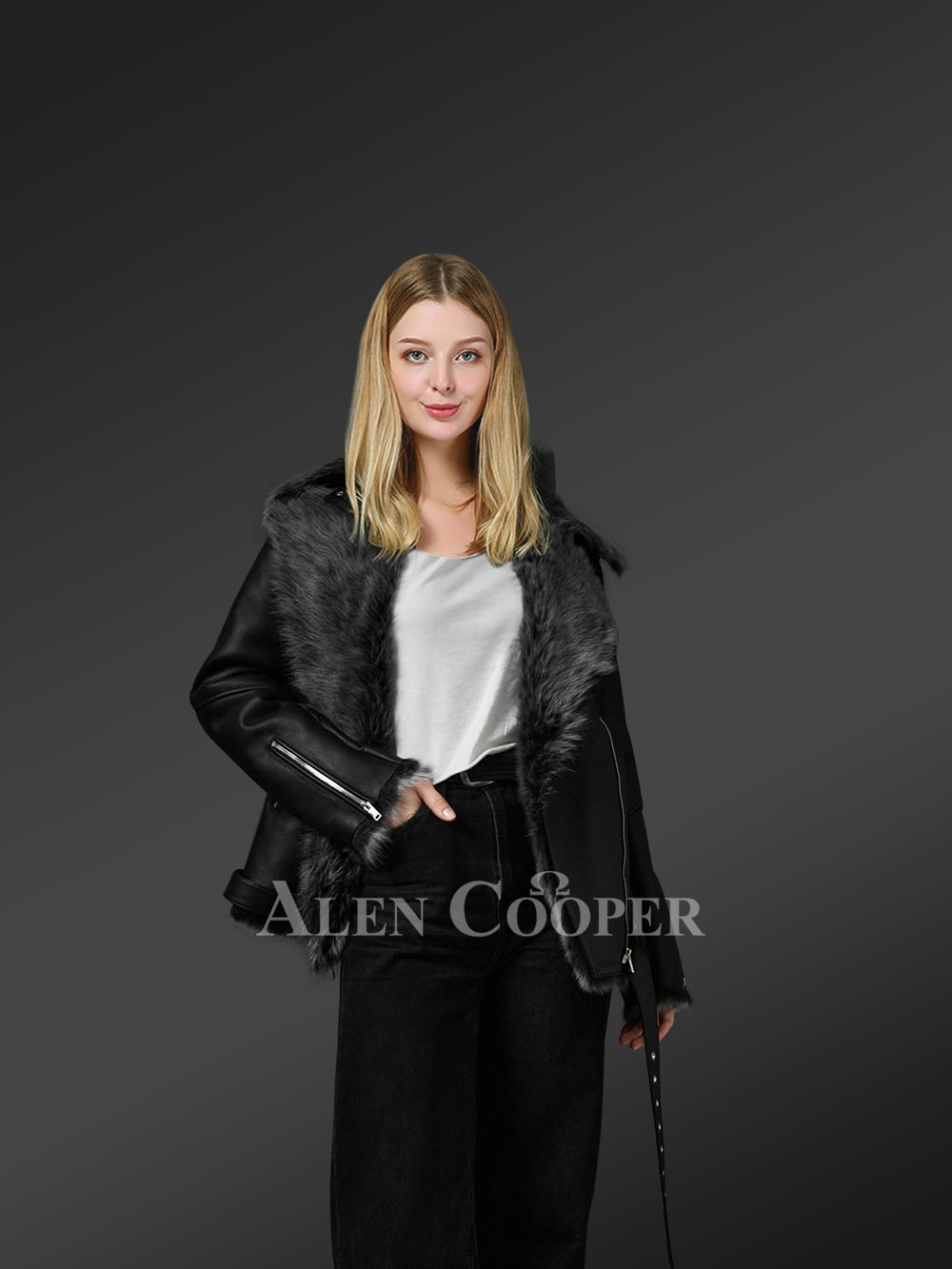 The jacket features voguish zippered sleeves. High-quality chromium-finished zippered are installed for ensuring optimum insulation inside the winter wear. The stylish Toscana shearling jacket for women also has an inbuilt belt along the waistline with a buckle. In addition, there is another belt along the neckline embellishing the overall look and feel of the plush winter wear.