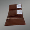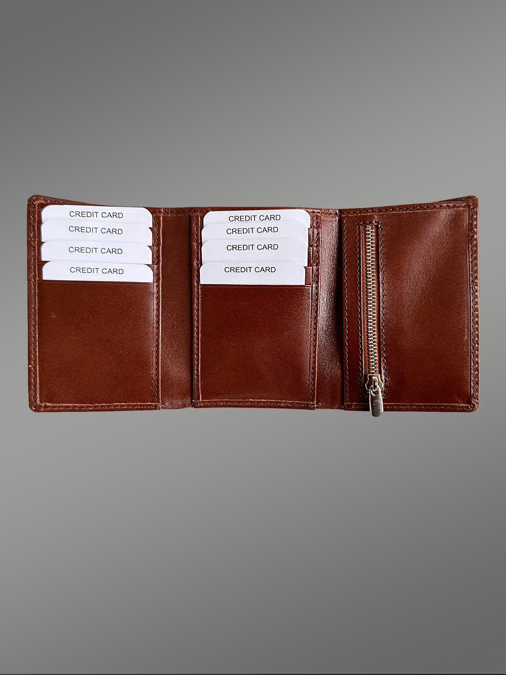 This tri-fold leather wallet has three different compartments along with eight slots for the cards. The left-hand side as well as the middle fold is designed with eight slots of varying sizes. They can house different types of cards based upon their varying lengths. Each slot is handcrafted using milled cowhide.